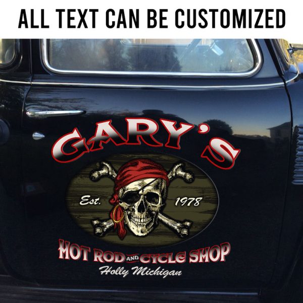 2 Pcs Personalized Hot Rod And Cycle Shop Pirate Skull Old School Garage Vinyl Stickers