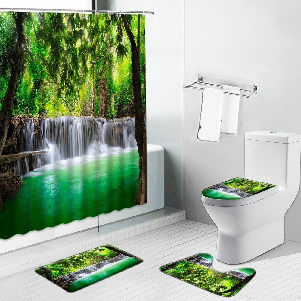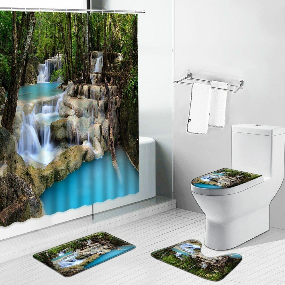 3D Waterfall Forest Trees Scenery Bathroom Shower Curtain Home Decor