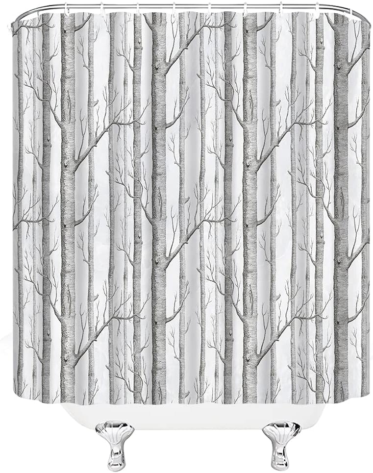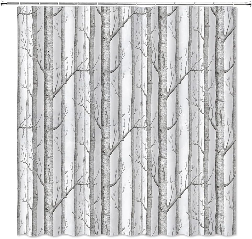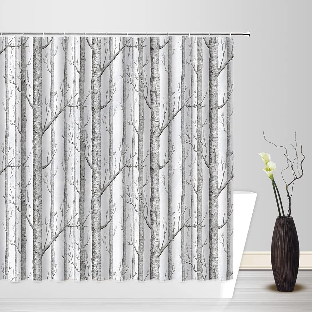 Abstract Tree Shower Curtain – Grey White Abstract Birch Forest Bird Country Nature Landscape Bathroom Decor Curtain