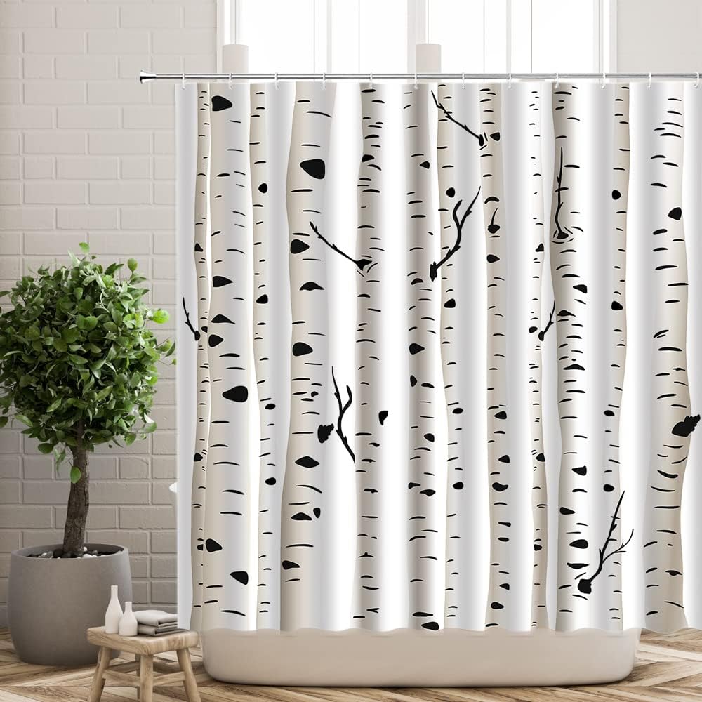 Abstract White Forest Trunks Shower Curtain with Birch Trees for Modern Bathroom Decor