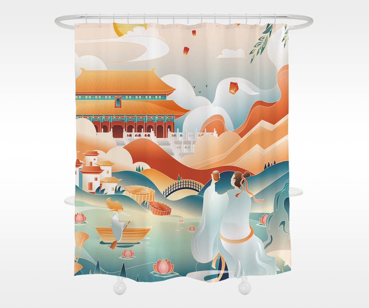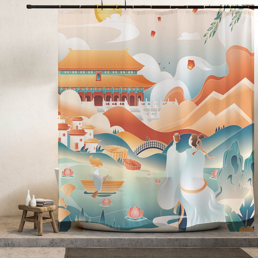 Ancient Night Moon Chinese Style Shower Curtain – Waterproof Fabric for Bathroom