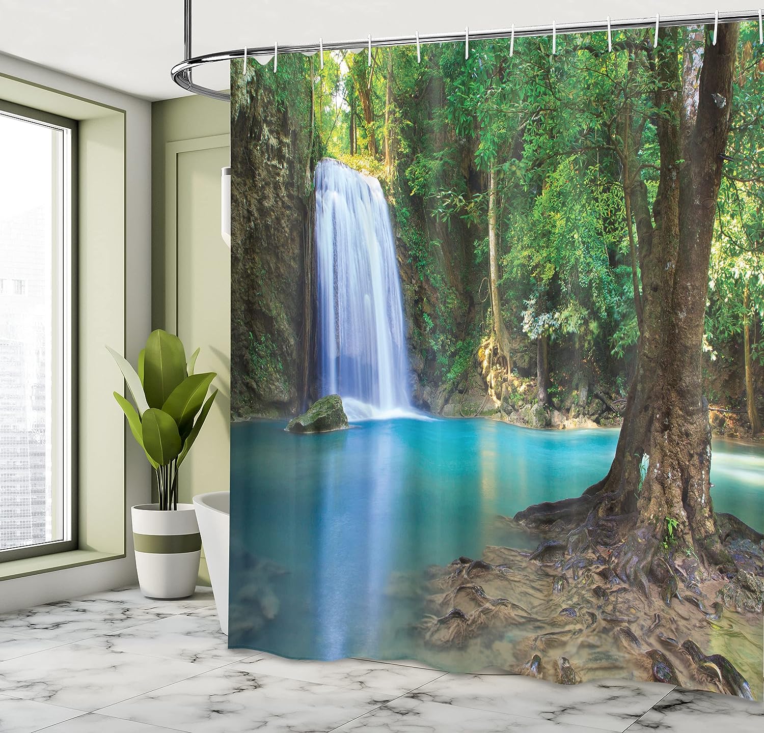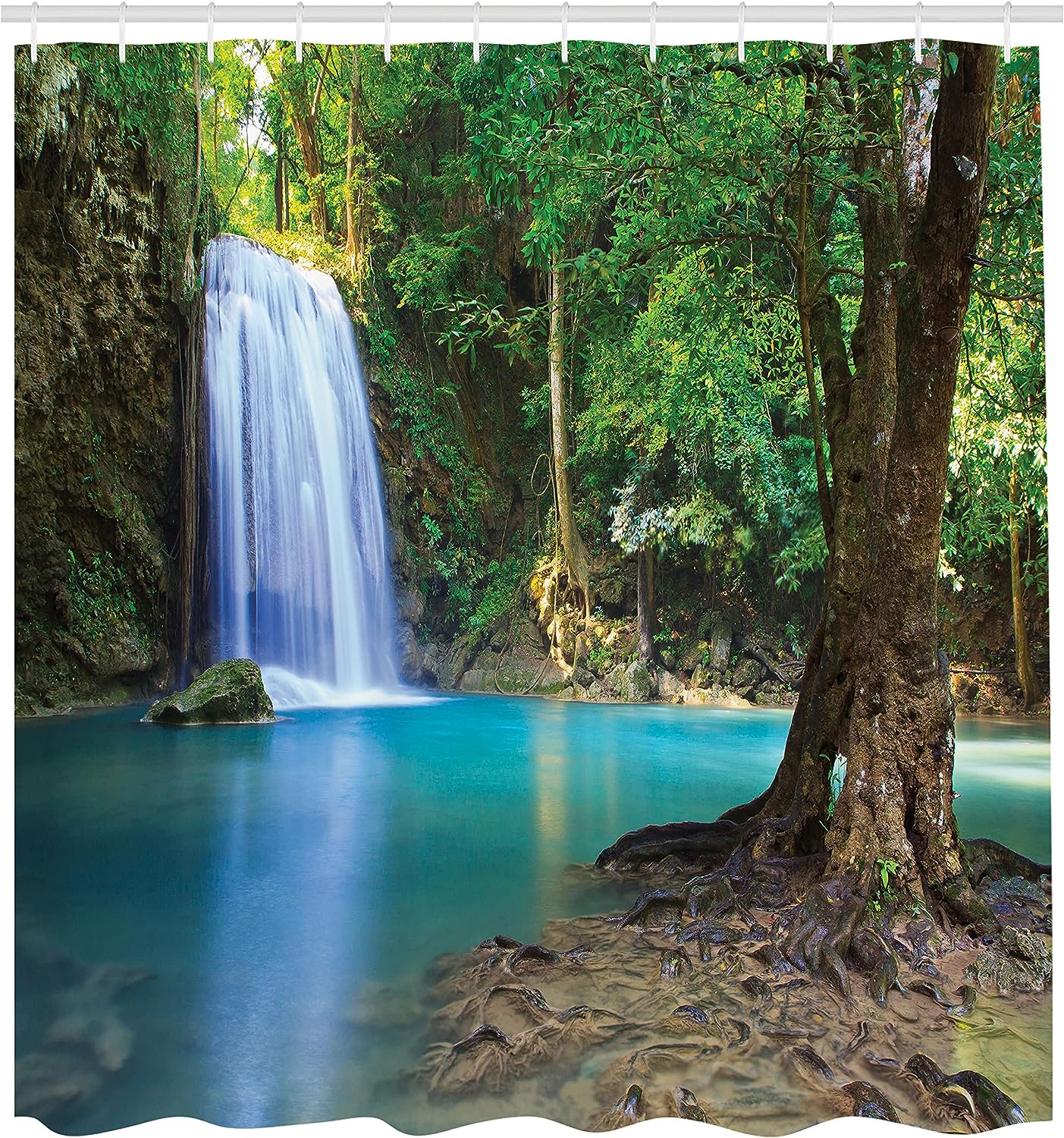 Asian Waterfall Shower Curtain, Waterfall Tourist Attraction in Thailand Jungle, Cloth Bathroom Decor W, Turquoise Blue