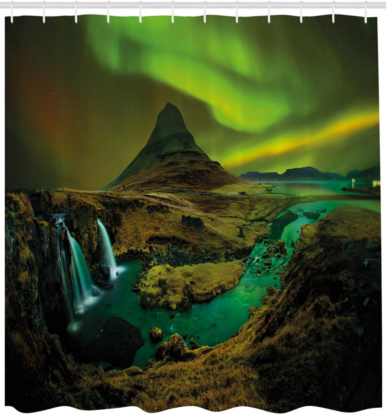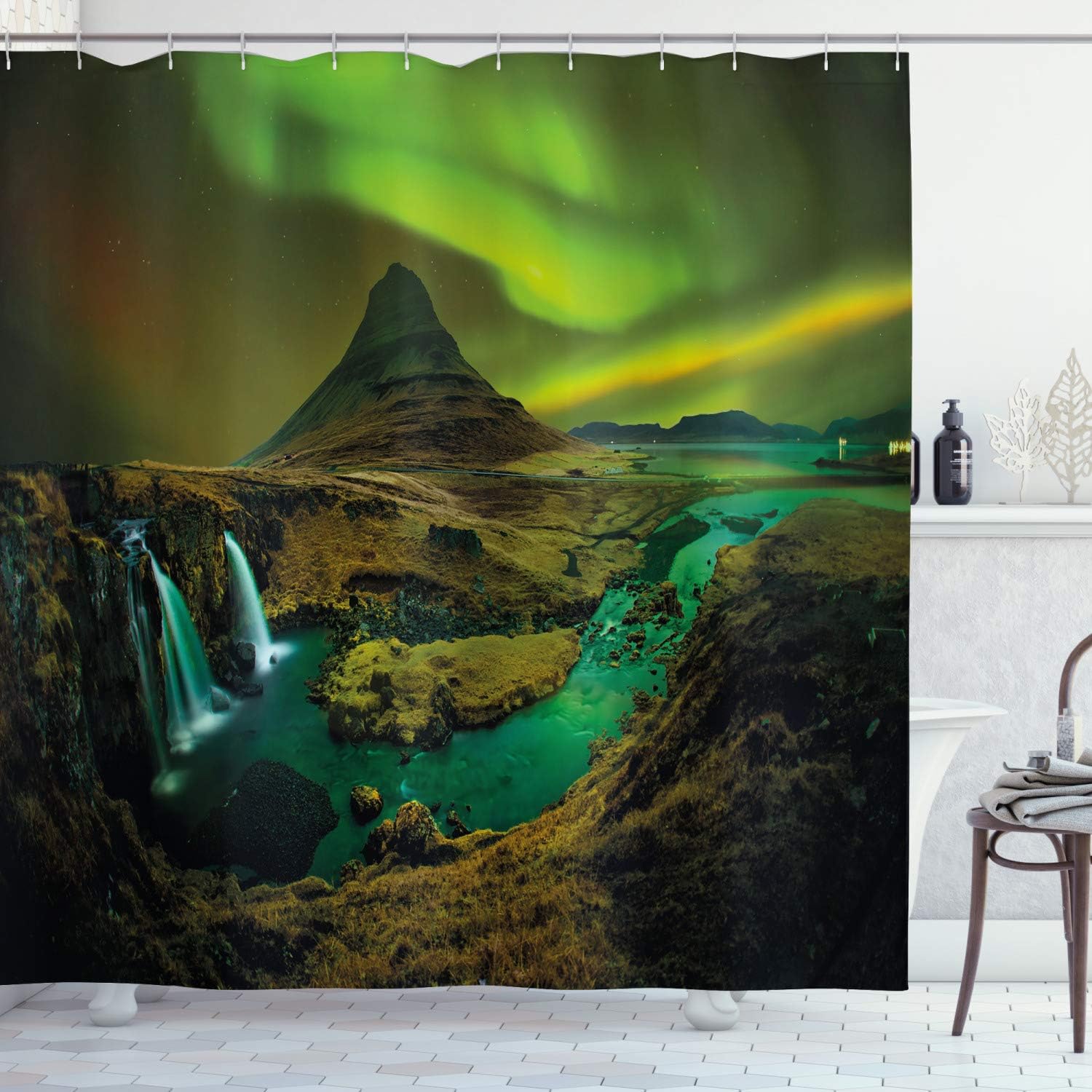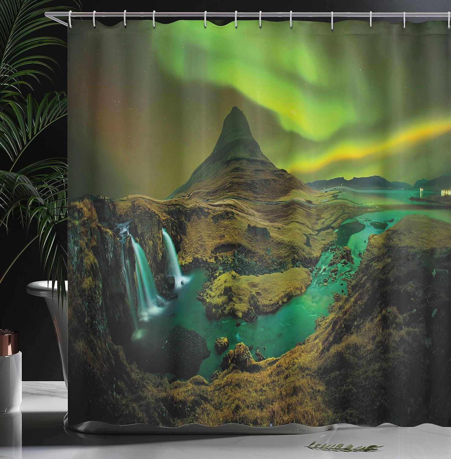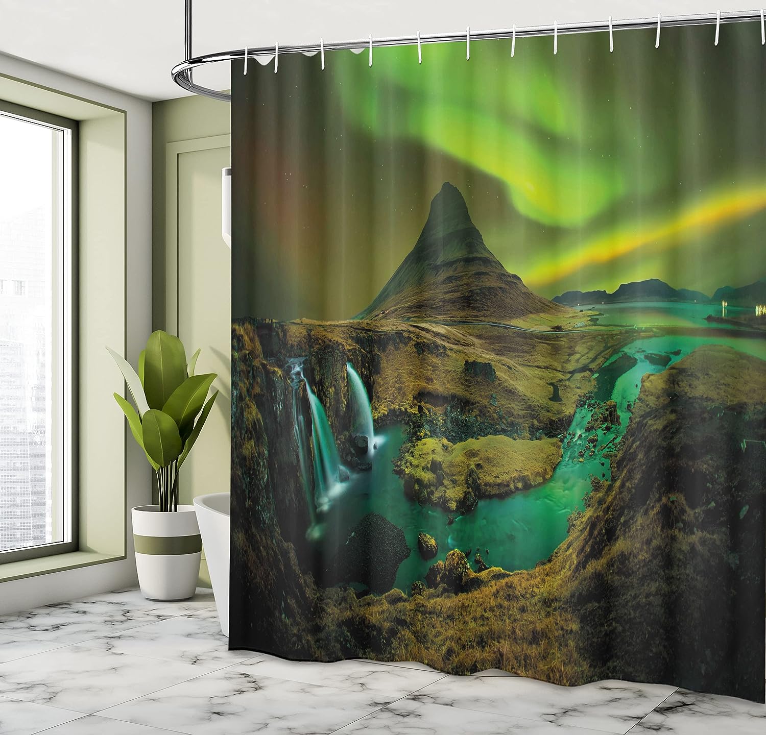 Aurora Borealis Shower Curtain, Nature Landscape Cloth Bathroom Decor in Fern and Olive Green