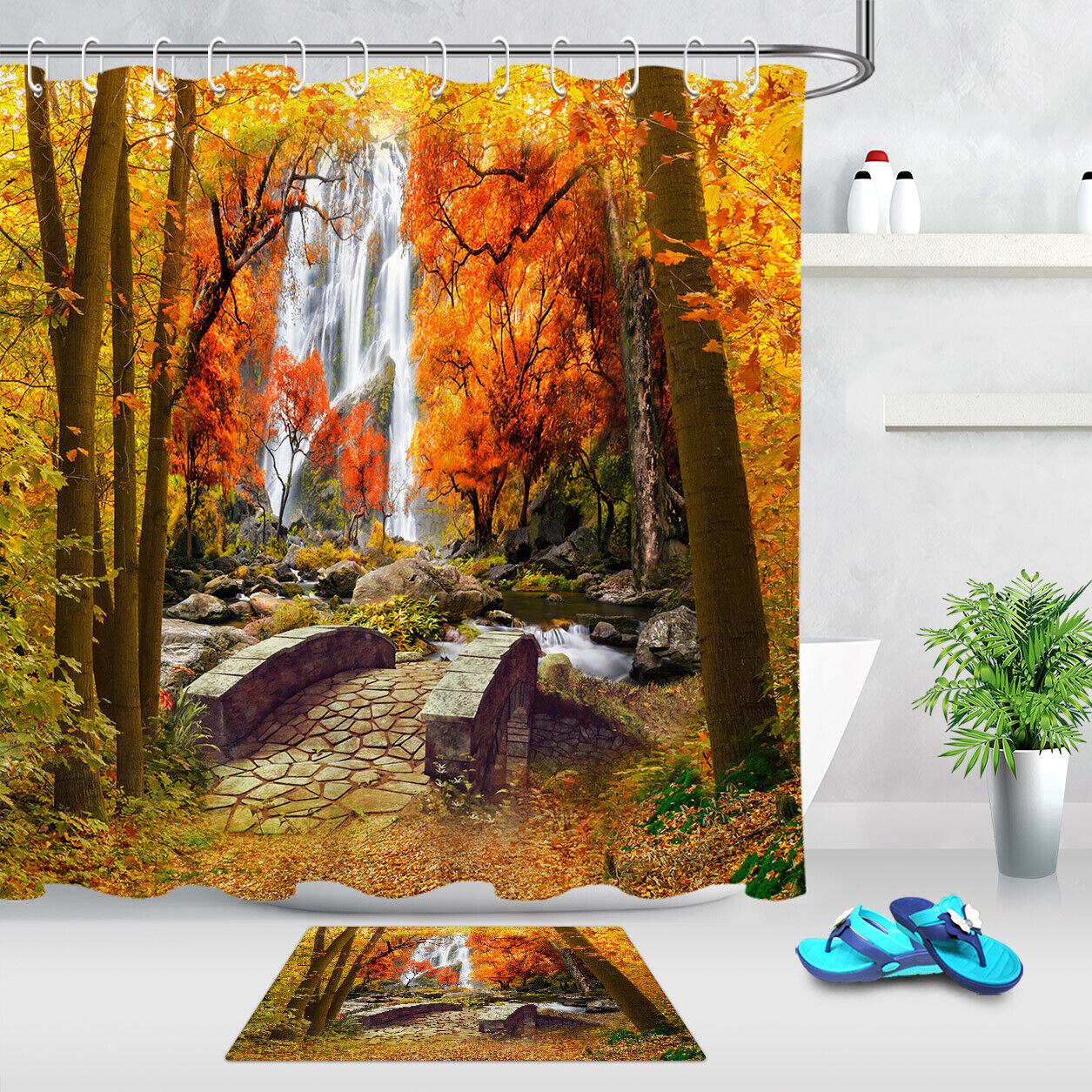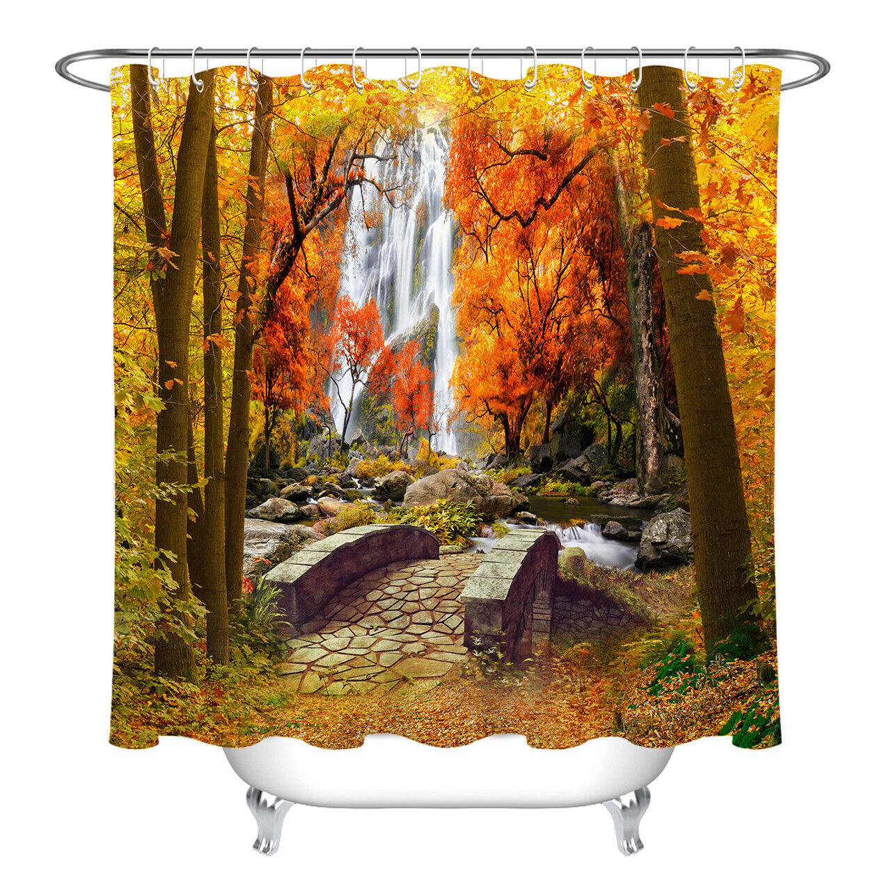Autumn Forest Waterfall Shower Curtain – Natural Scenery for Rustic Bathroom Decor
