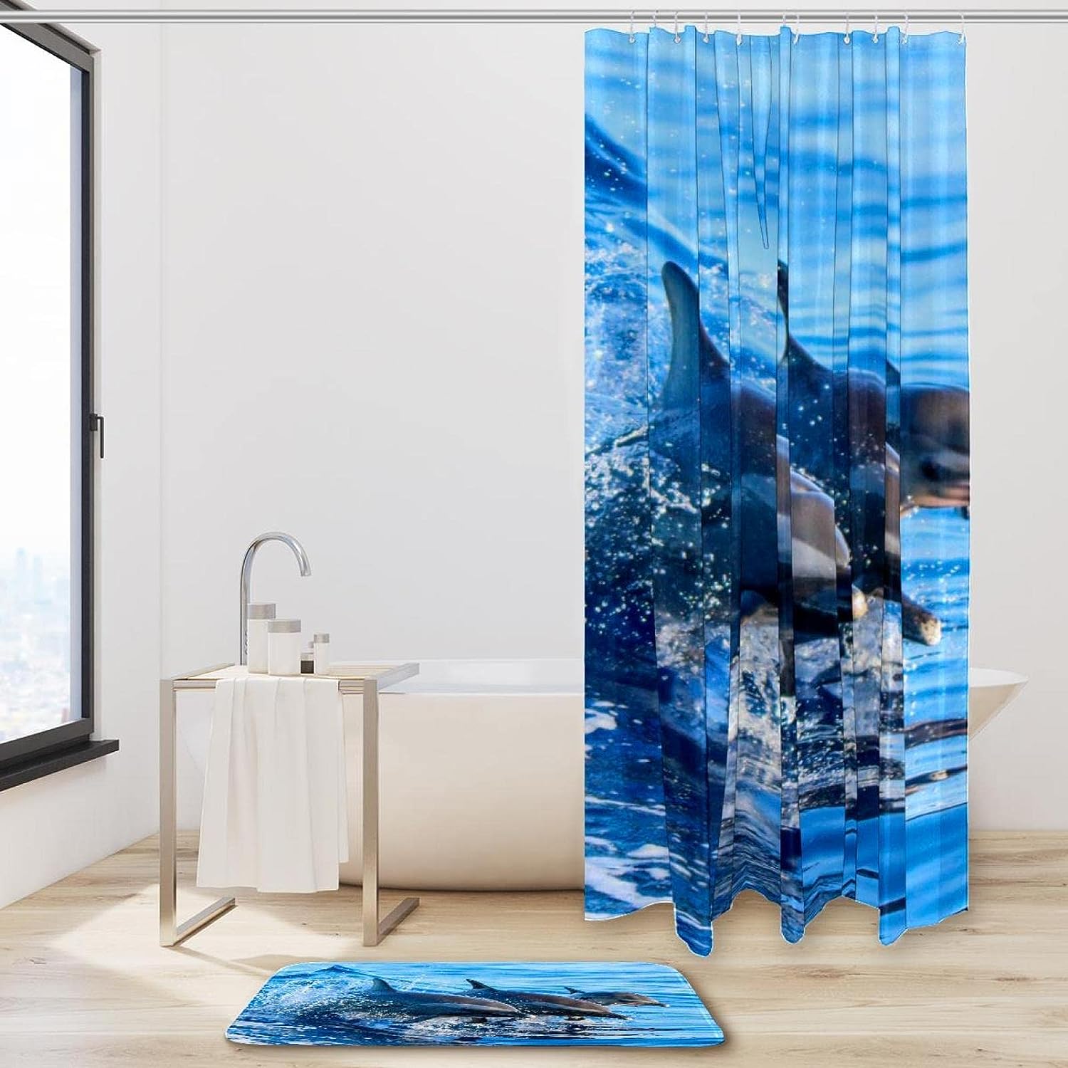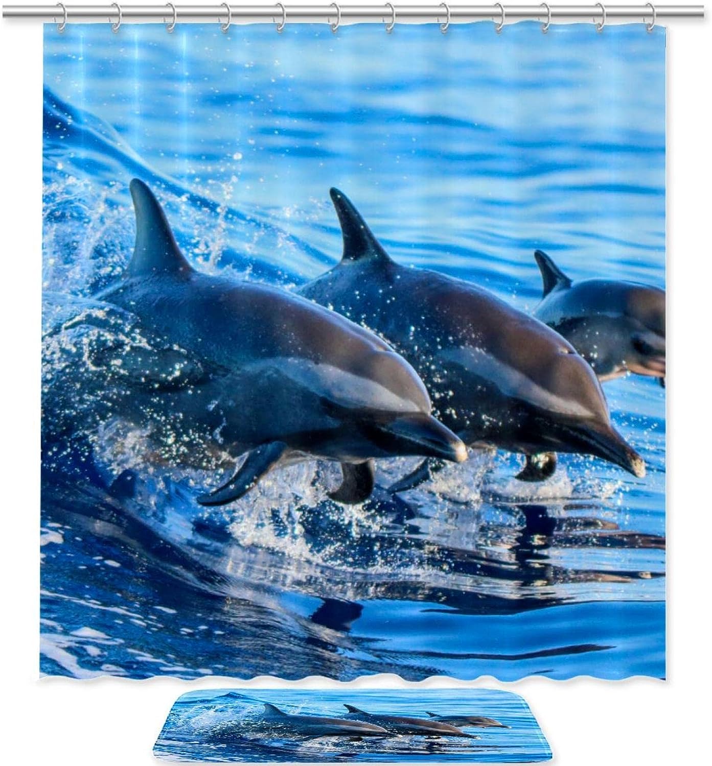 Blue Dolphin Shower Curtain and Mat for Your Beachy Bathroom Decor