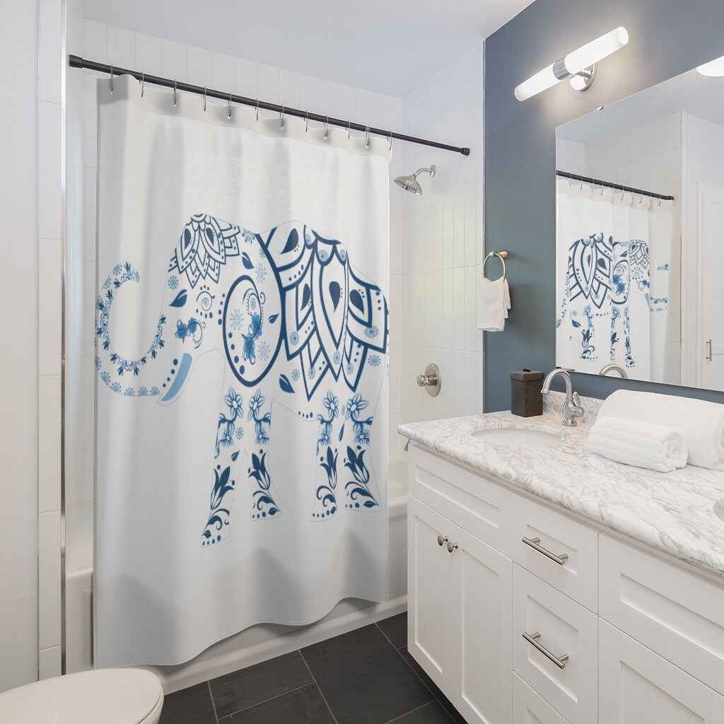 Blue Floral Elephant Shower Curtain for Bathroom – Boho Chic Home Decor