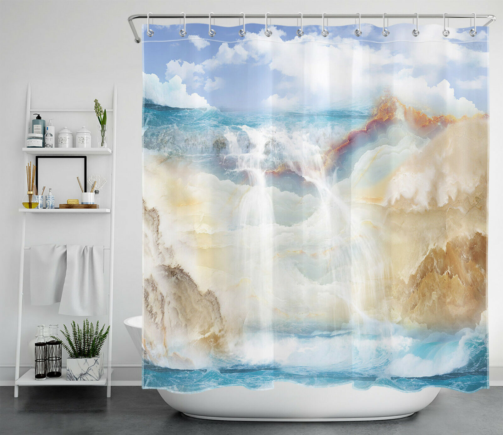 Blue Seascape Waterfall Marble Texture Shower Curtain – Bathroom Accessory with Unique Design