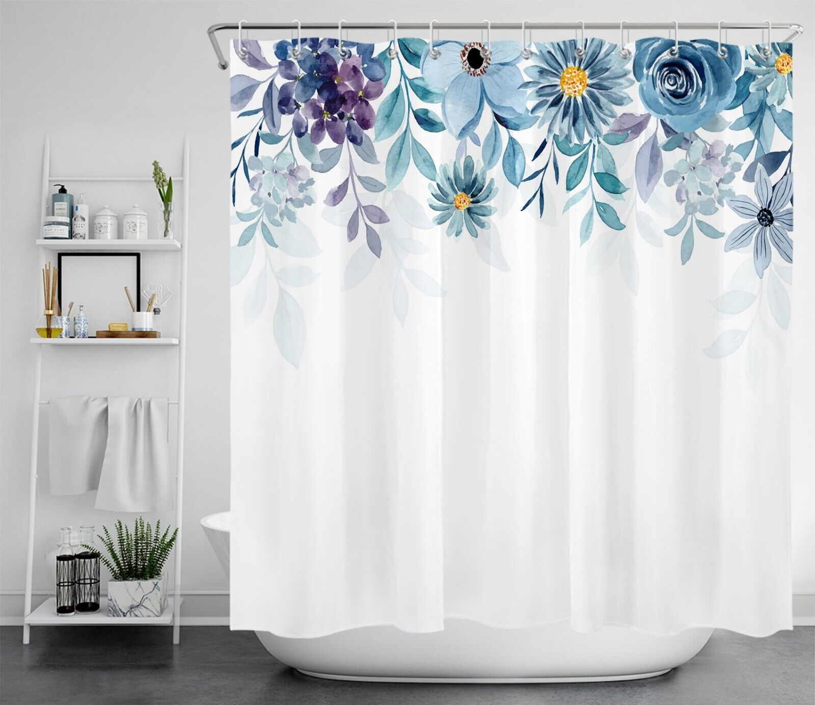 Blue Watercolor Flower Botanical Floral Shower Curtain – Bathroom and Home Decor