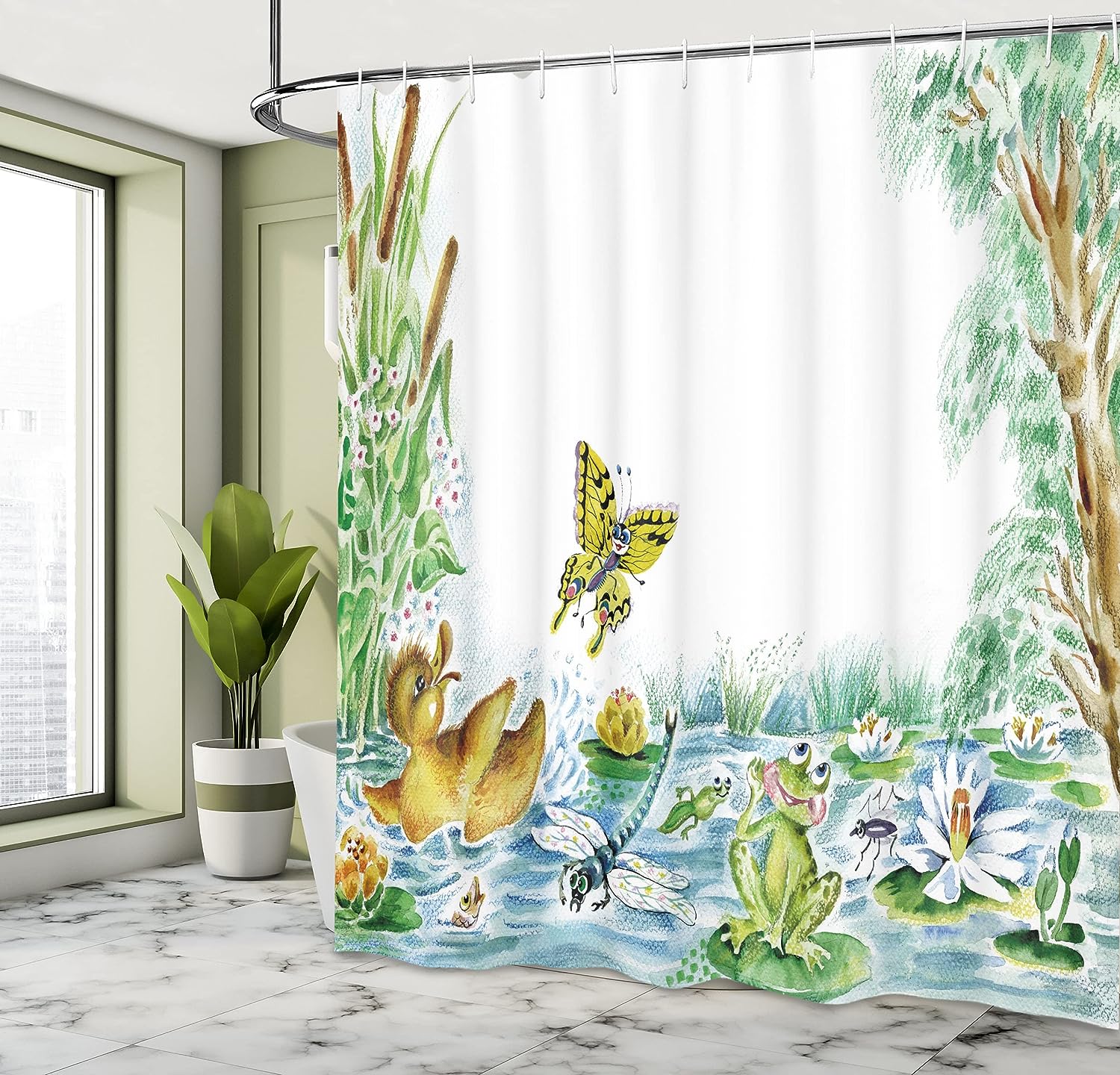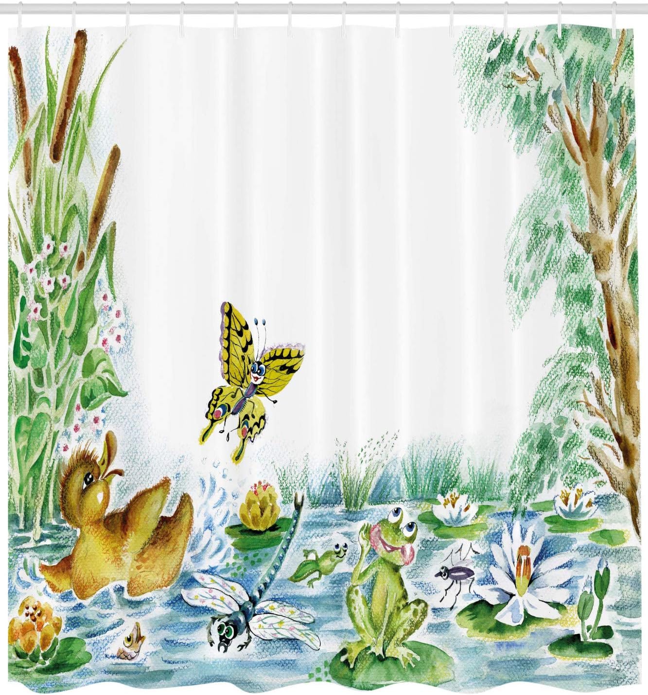 Butterfly Duckling and Frog Cloth Fabric Shower Curtain, Playing Together on Pond Flowers Trees Dragonfly, Bathroom Decor