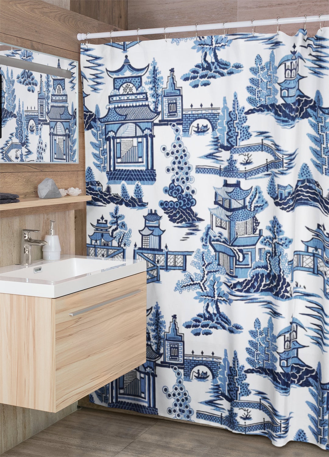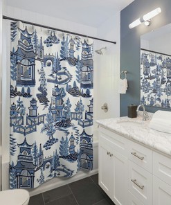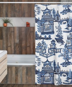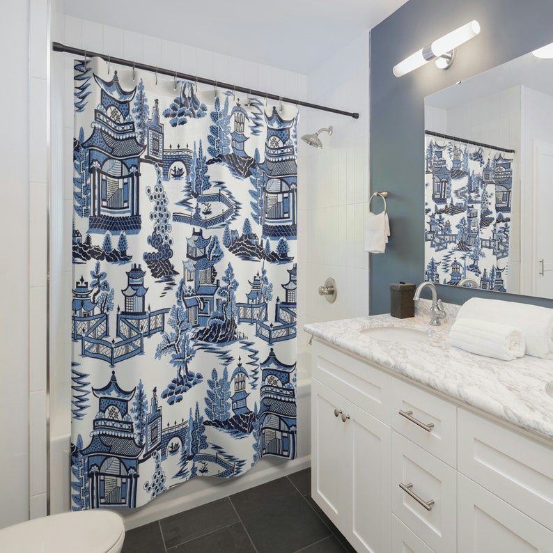 Chinoiserie Shower Curtain, Toile Shower Curtain, Blue And White Bathroom Curtain, Tub Curtain