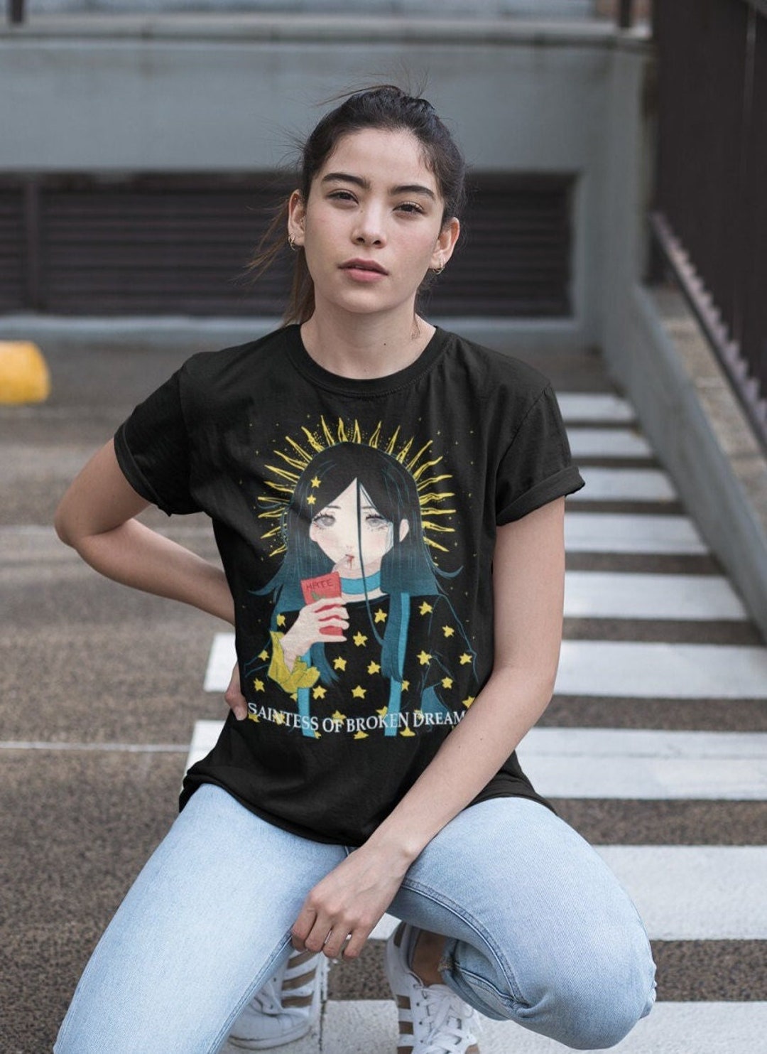 Closer To Heaven Creepy Anime Girl T-Shirt – Kawaii Pastel Goth Clothing with Japan Streetwear and Dark Harajuku Style
