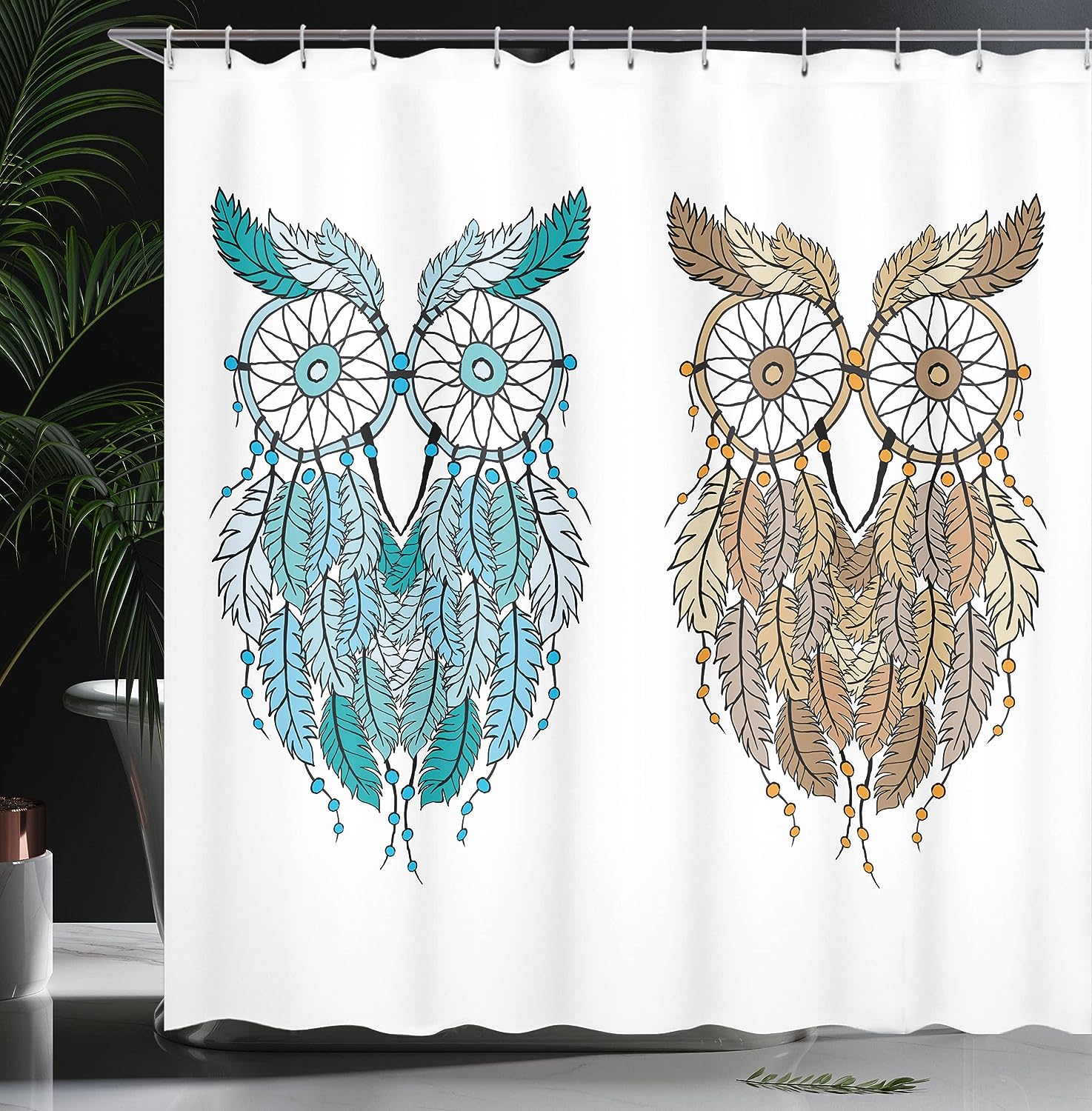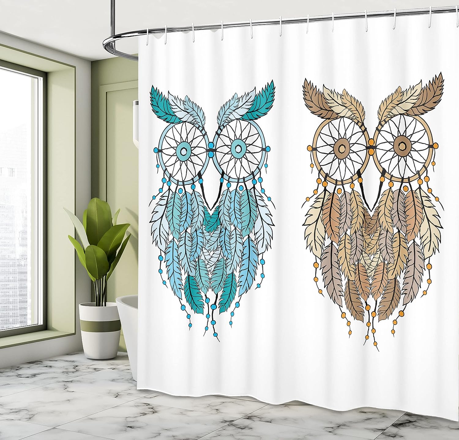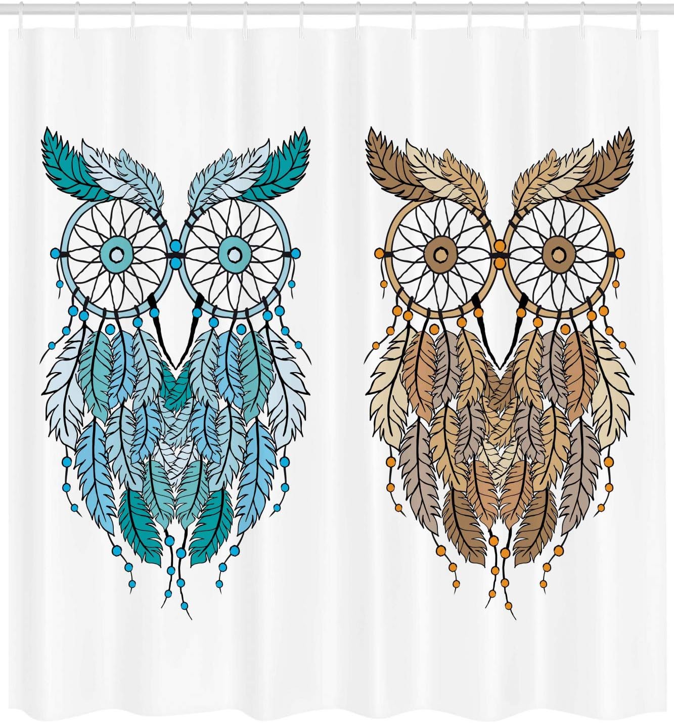 Cream White Teal Owl Shower Curtain, Dreamcatcher Style Magic Farsighted Birds, Bathroom Decor Home Decor