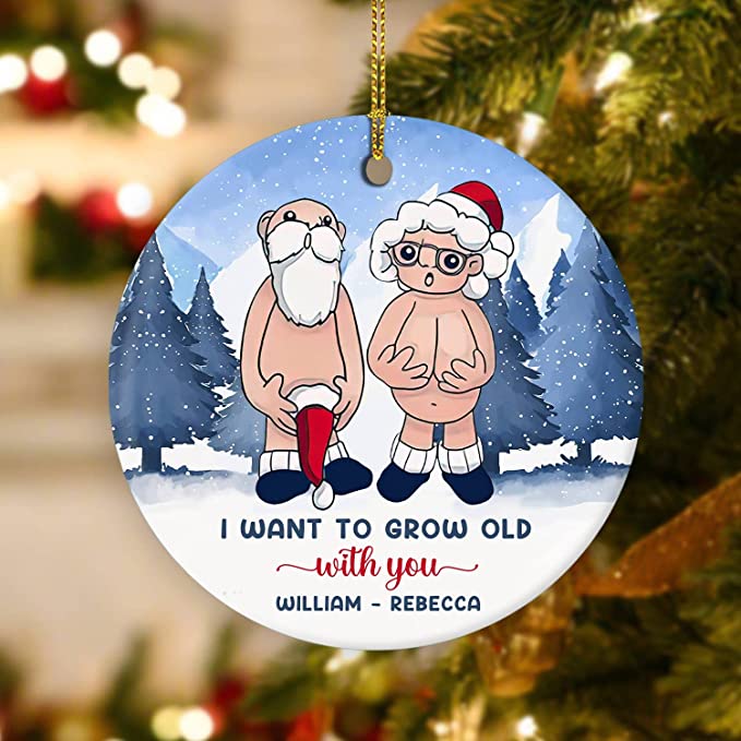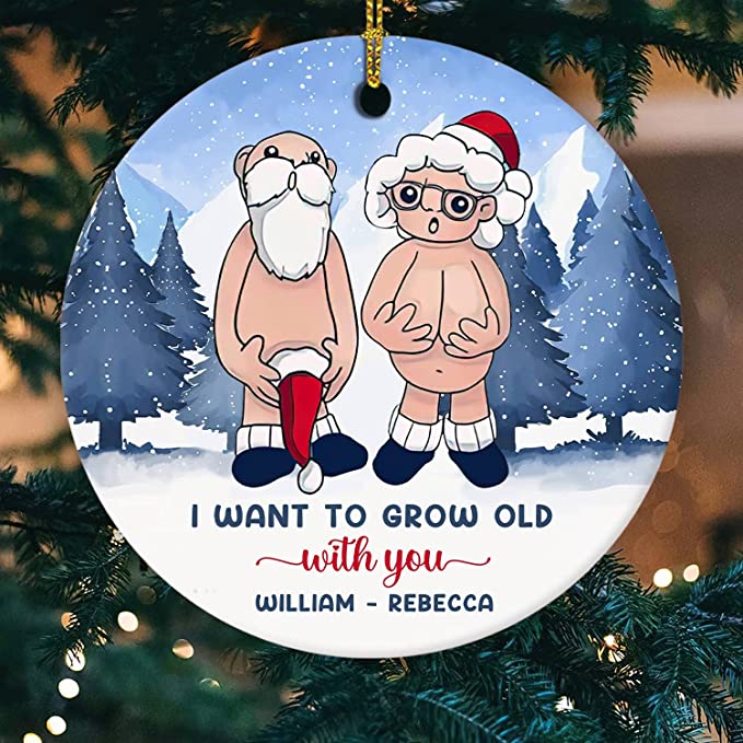 Custom Name I Want to Grow Old with You Ornament Christmas Decor, Personalized Anniversary Present for Old Couple Husband & Wife, 2022 Xmas Gifts Ceramic Ornament