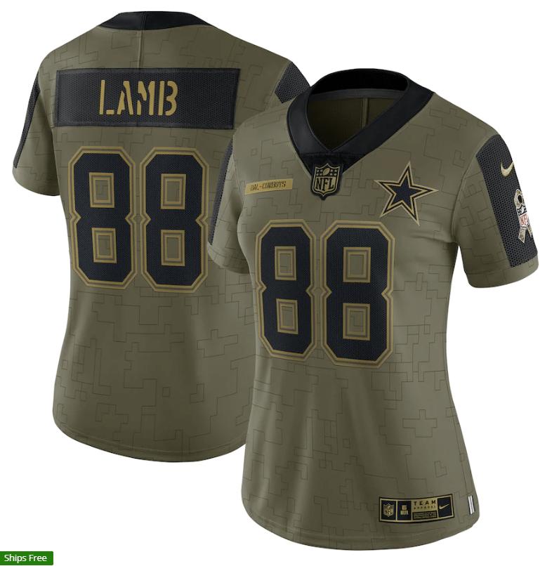 Dallas Cowboys Ceedee Lamb 88 Nfl Olive 2021 Salute To Service Retired Player Women Jersey For Cowboys Fans