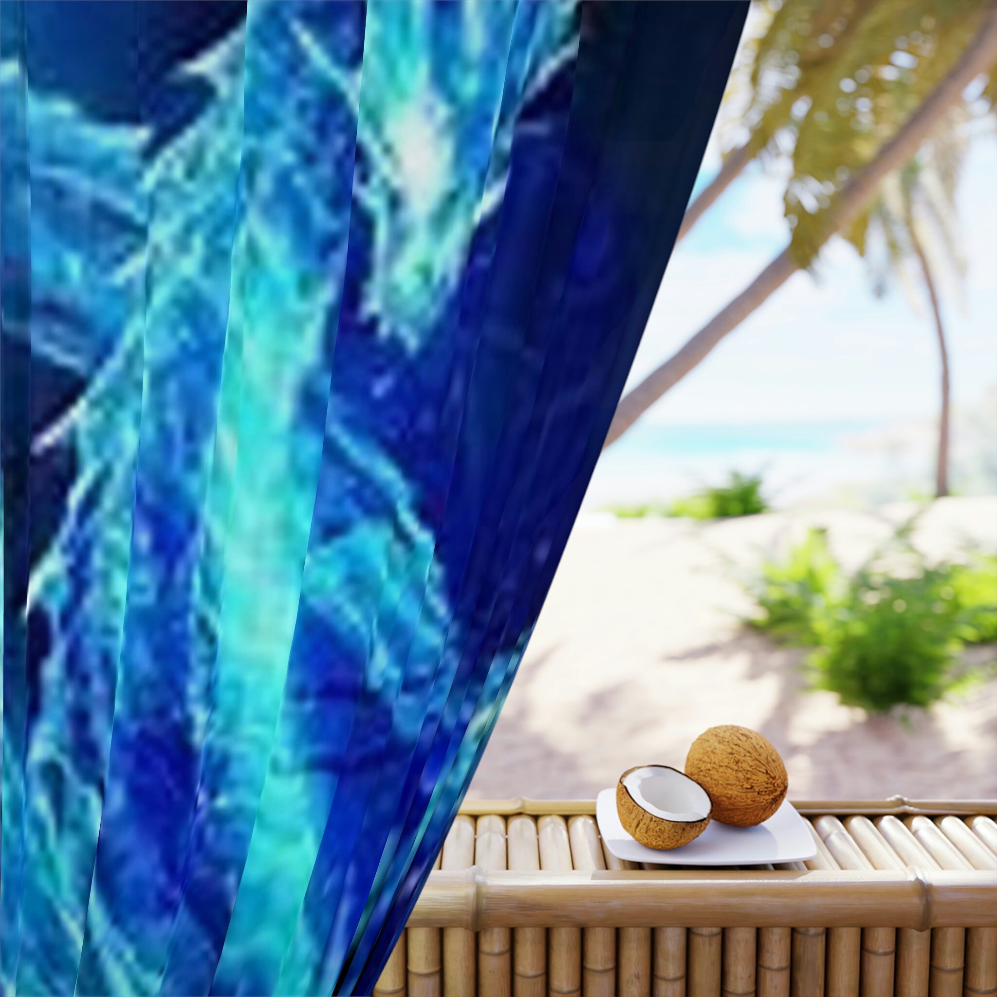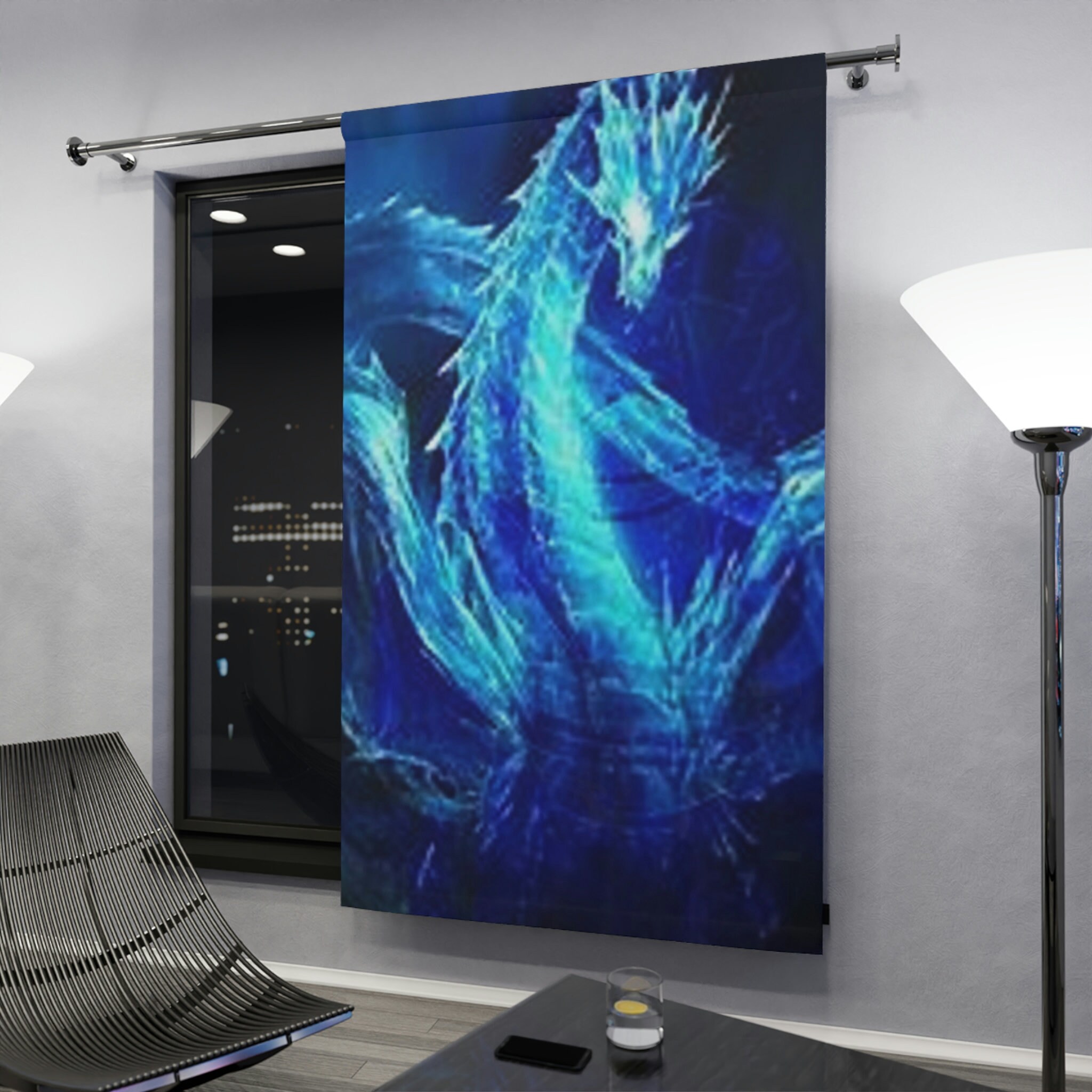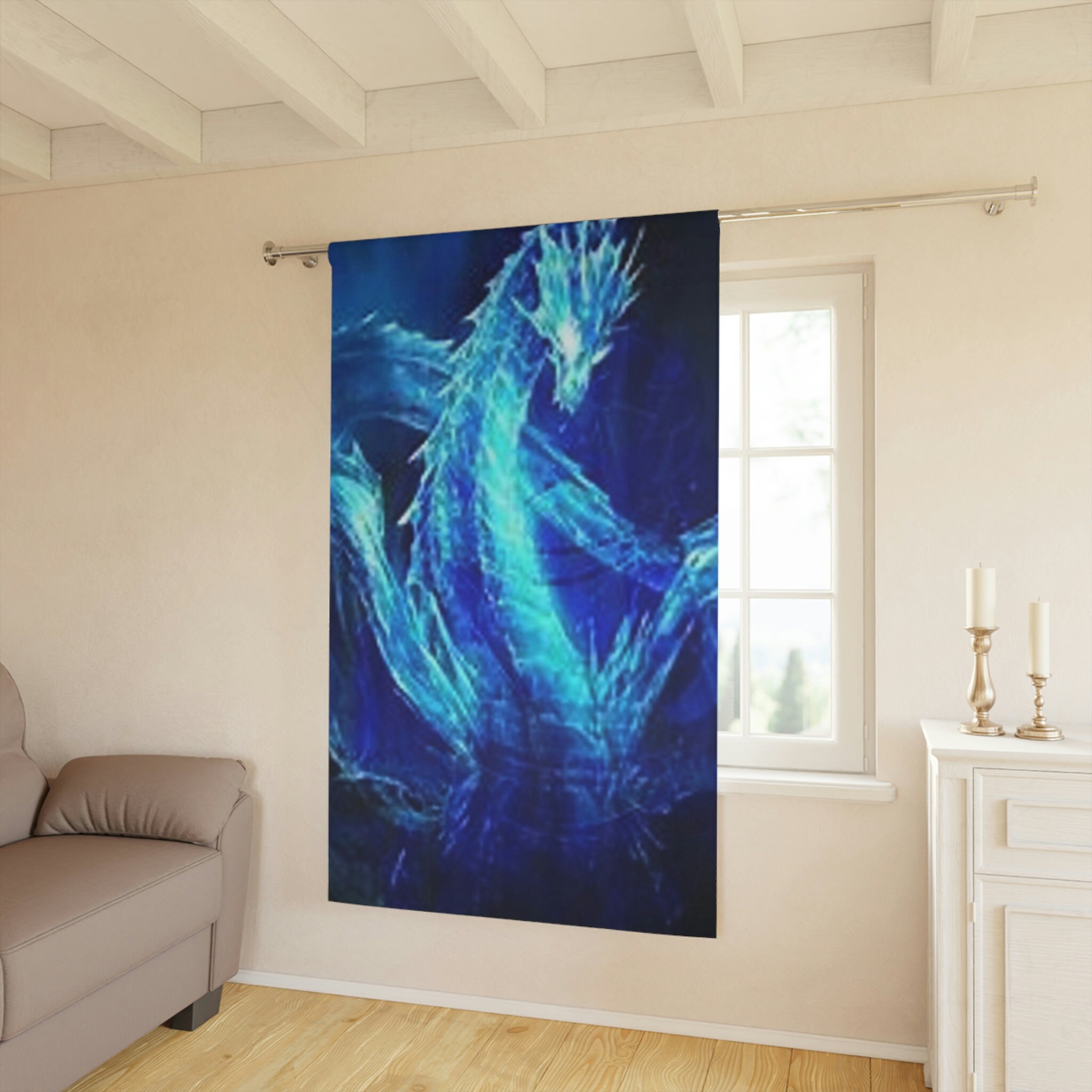 Dragon Window Curtain, Blue Design, Mythical Creature Decor