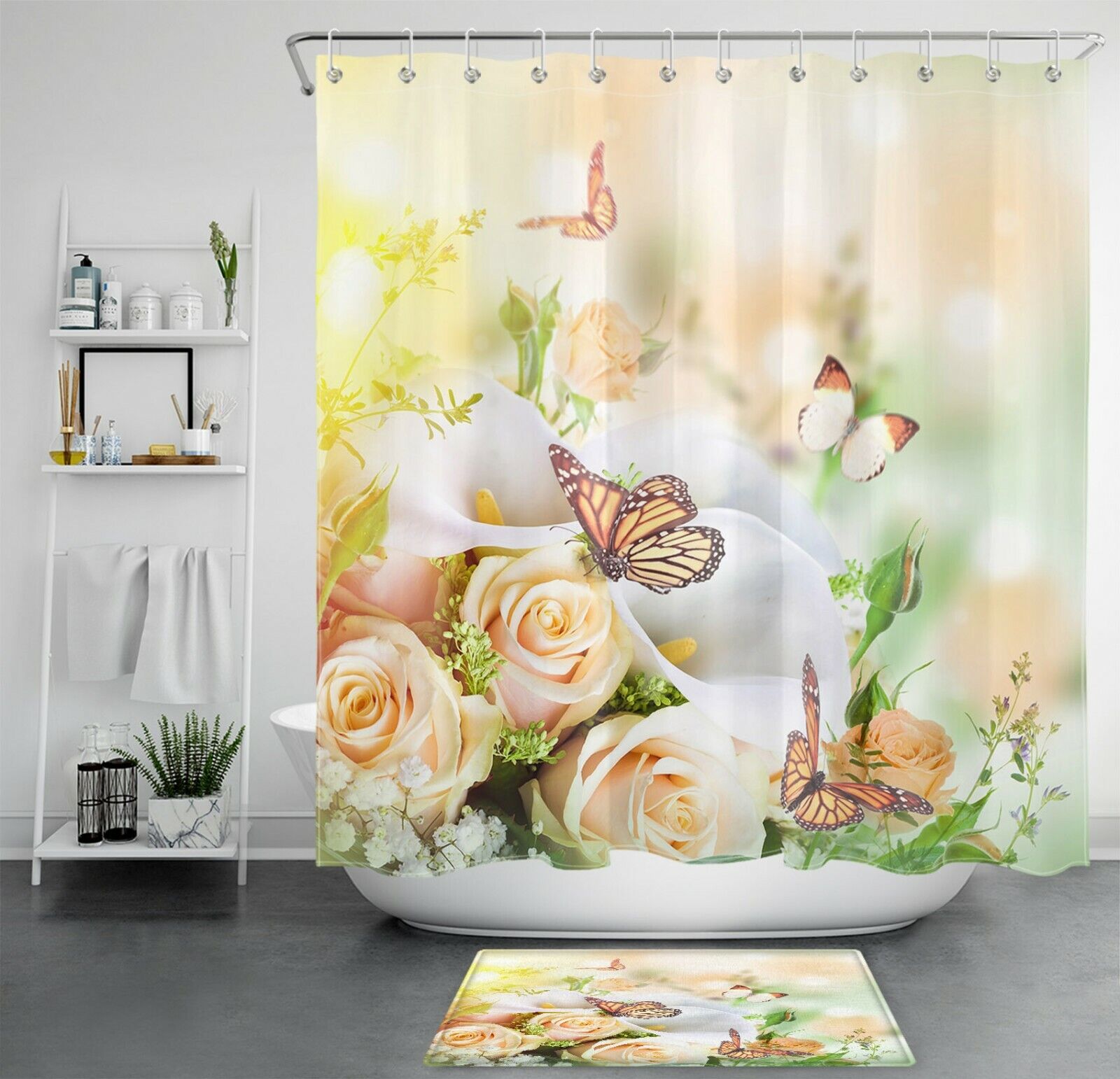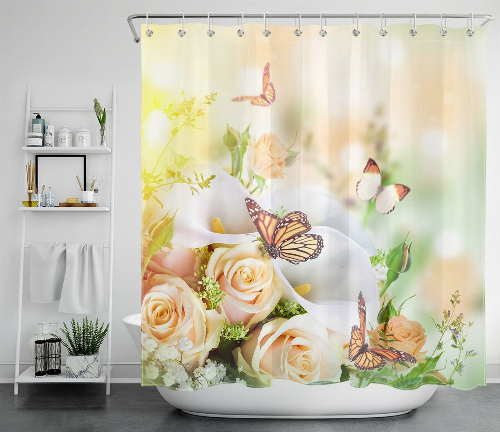 Flowers Butterfly Shower Curtain with Spring Sunshine for a Nature-Inspired Bathroom Decor