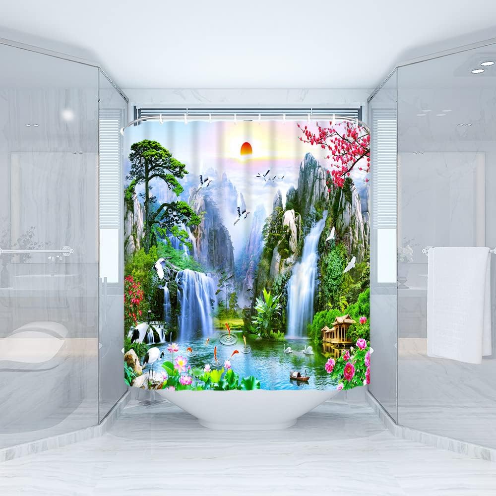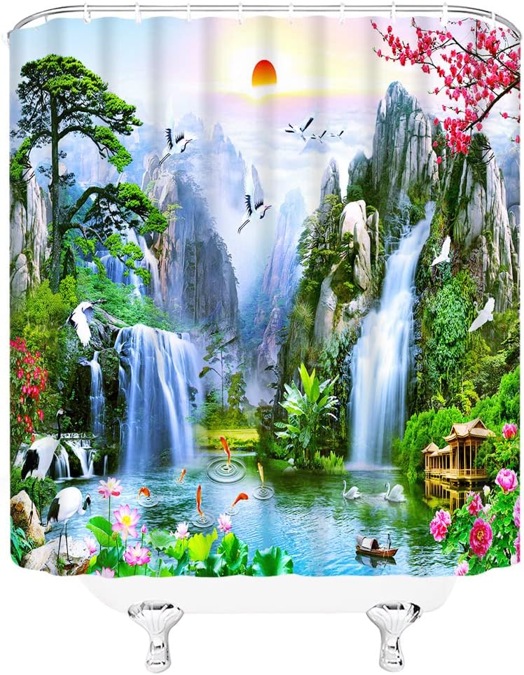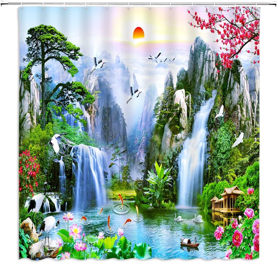 Forest Waterfall Landscape Shower Curtain with Birds, Flower and Tree Design