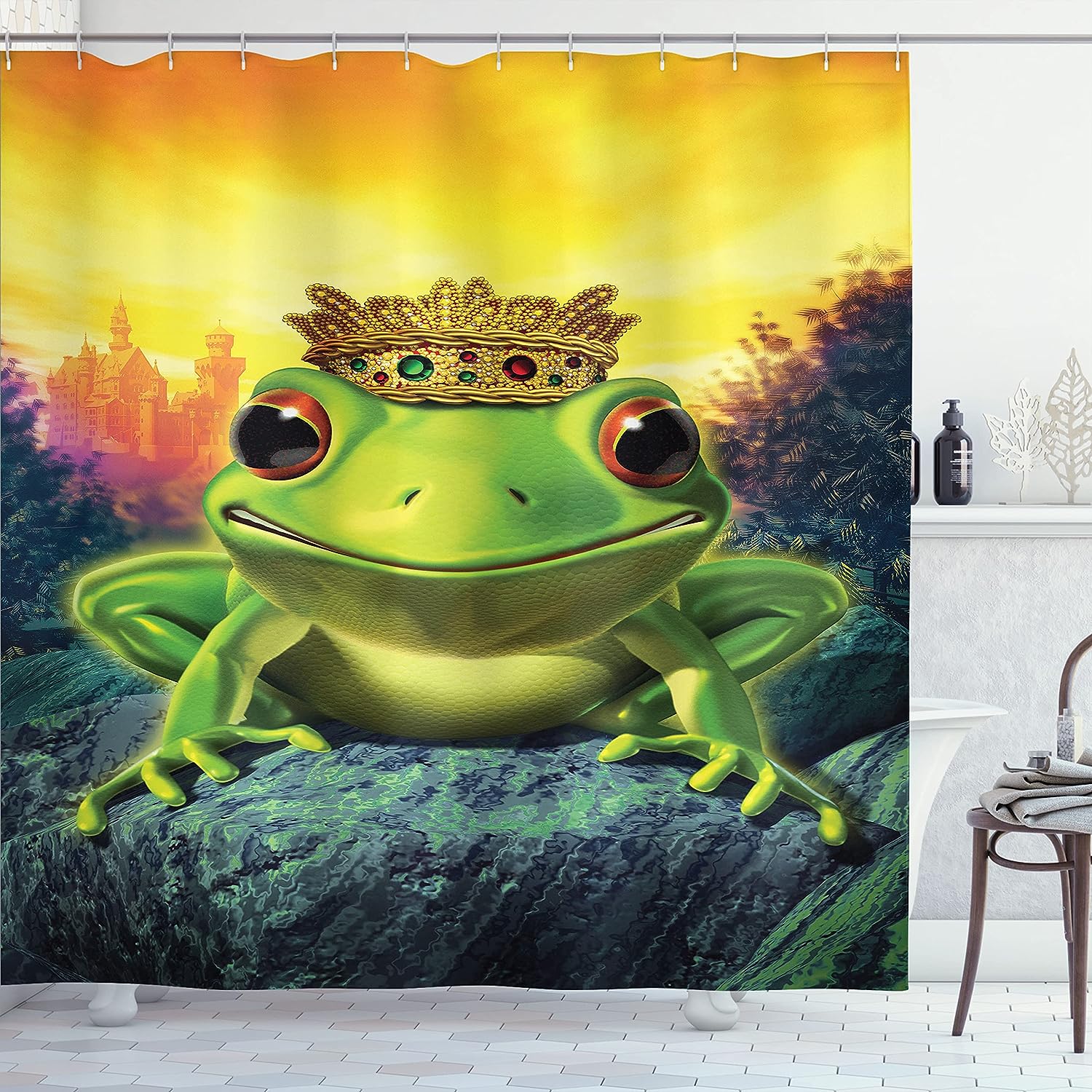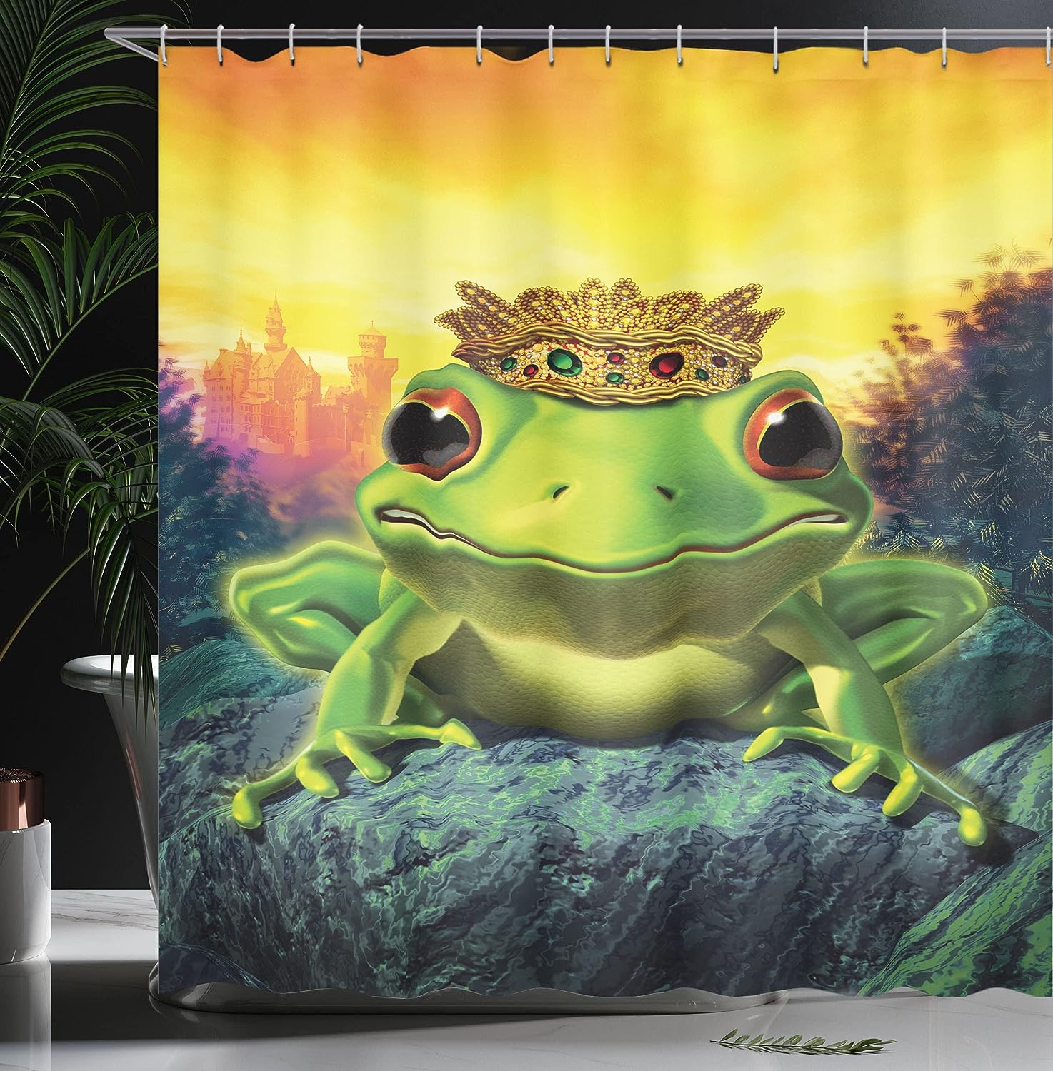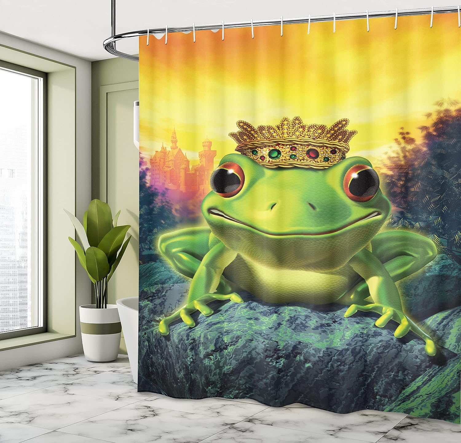 Frog Prince Shower Curtain, Golden Yellow Crown on Rocks Soul Mates Illustration- Home Decor