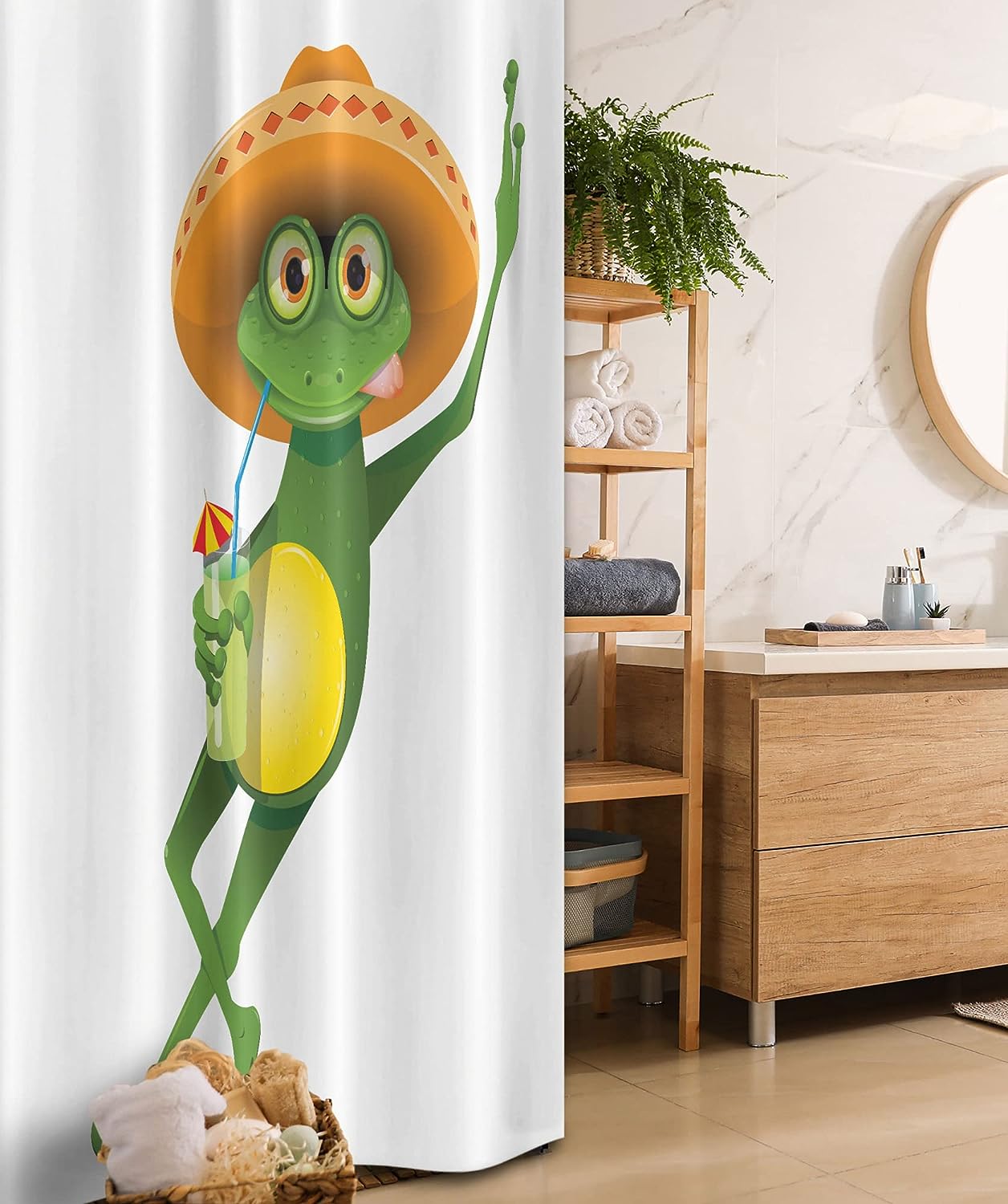 Frog Shower Curtain, Sombrero and Cocktail Drink Glass Fauna Hot Weather Print in Fern Green Apricot, Fabric Bathroom Decor