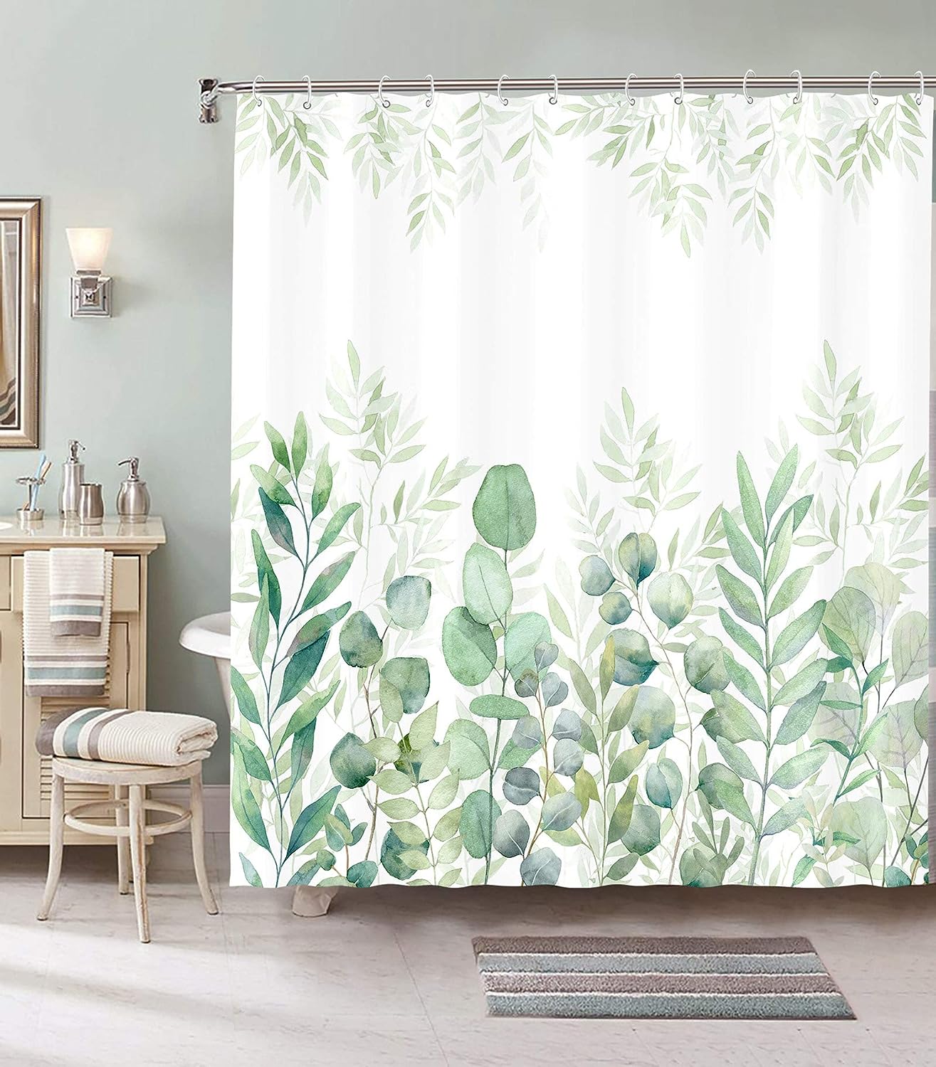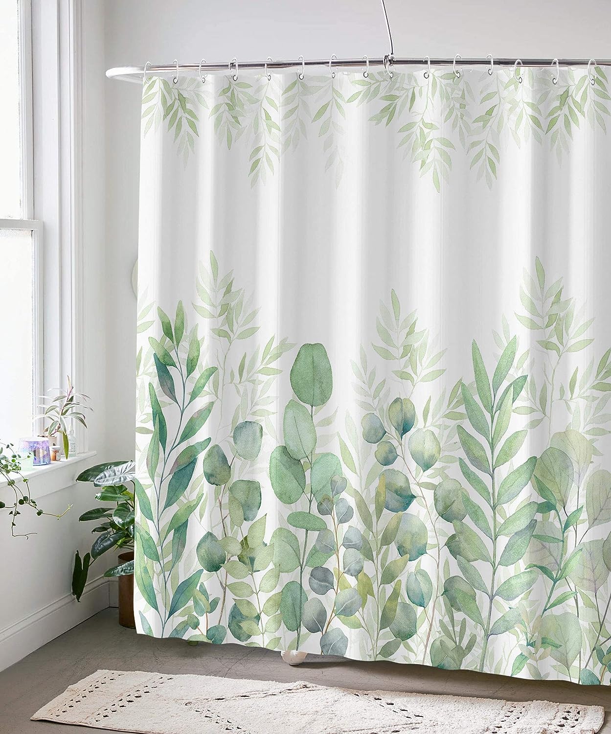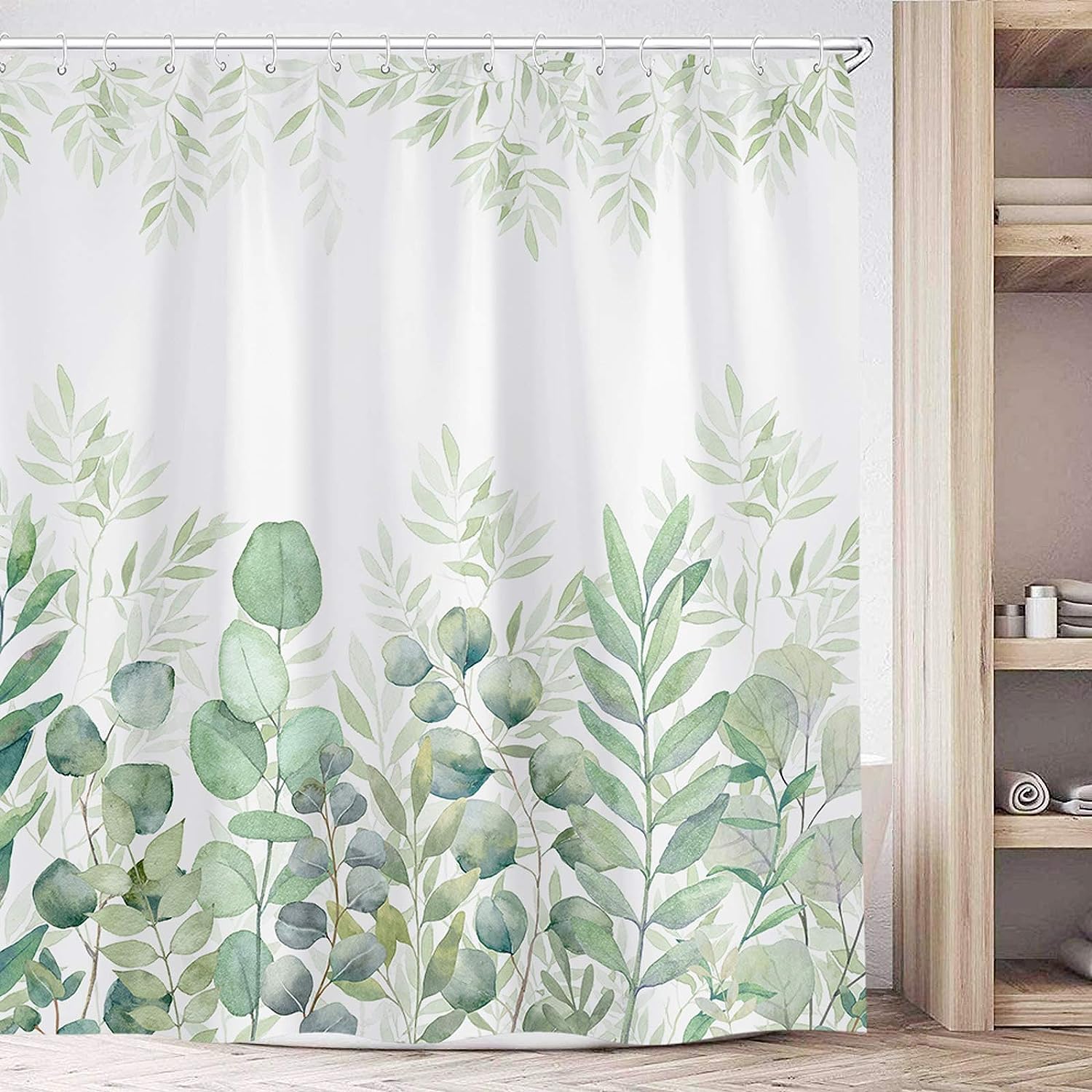 Green and White Plant Leaves Shower Curtain – Fabric for Bathroom Home Decor