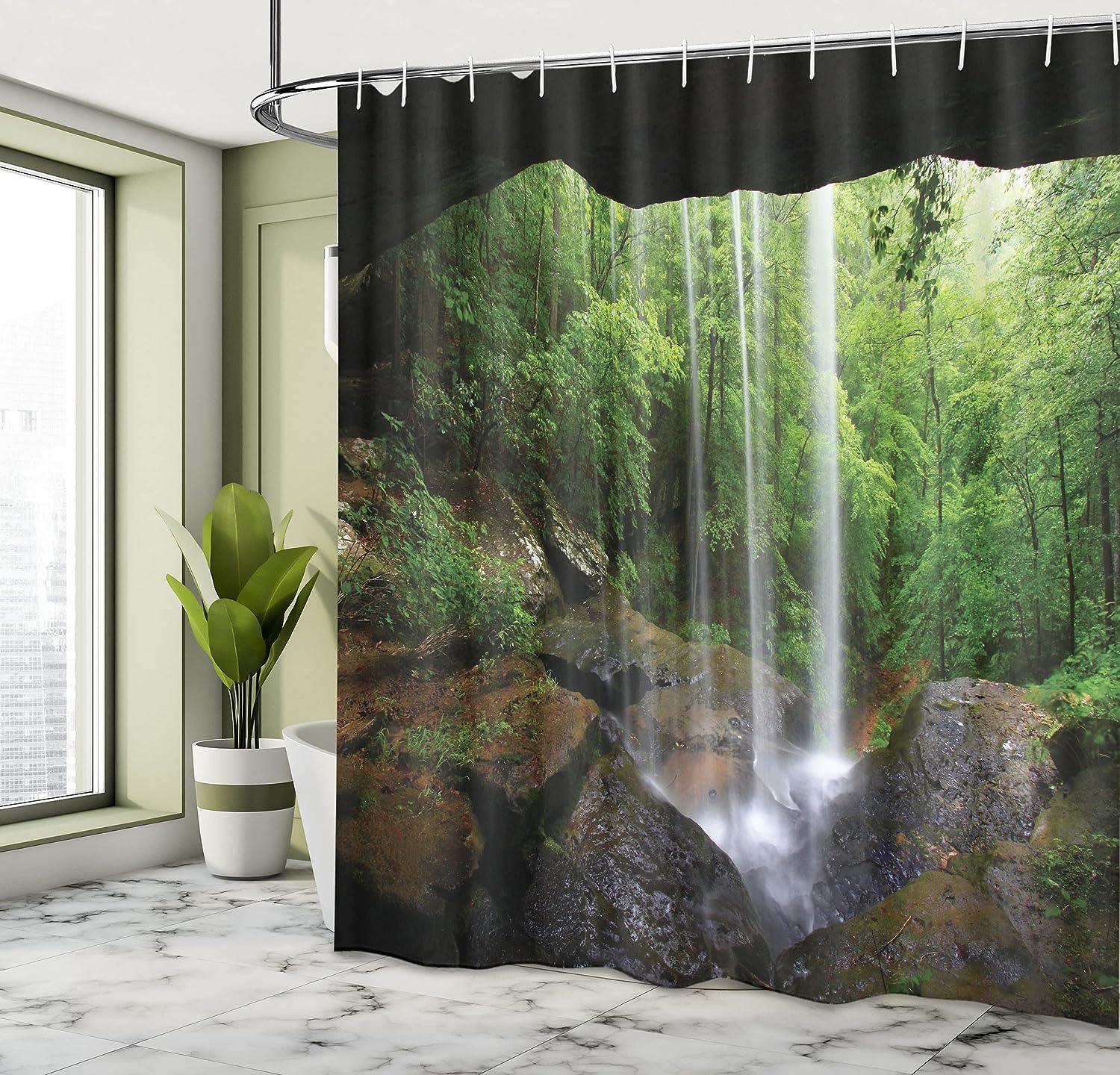 Green Brown Natural Cave Shower Curtain with Still Waterfall and Northern Alabama Habitat Design for a Calm Bathroom Decor