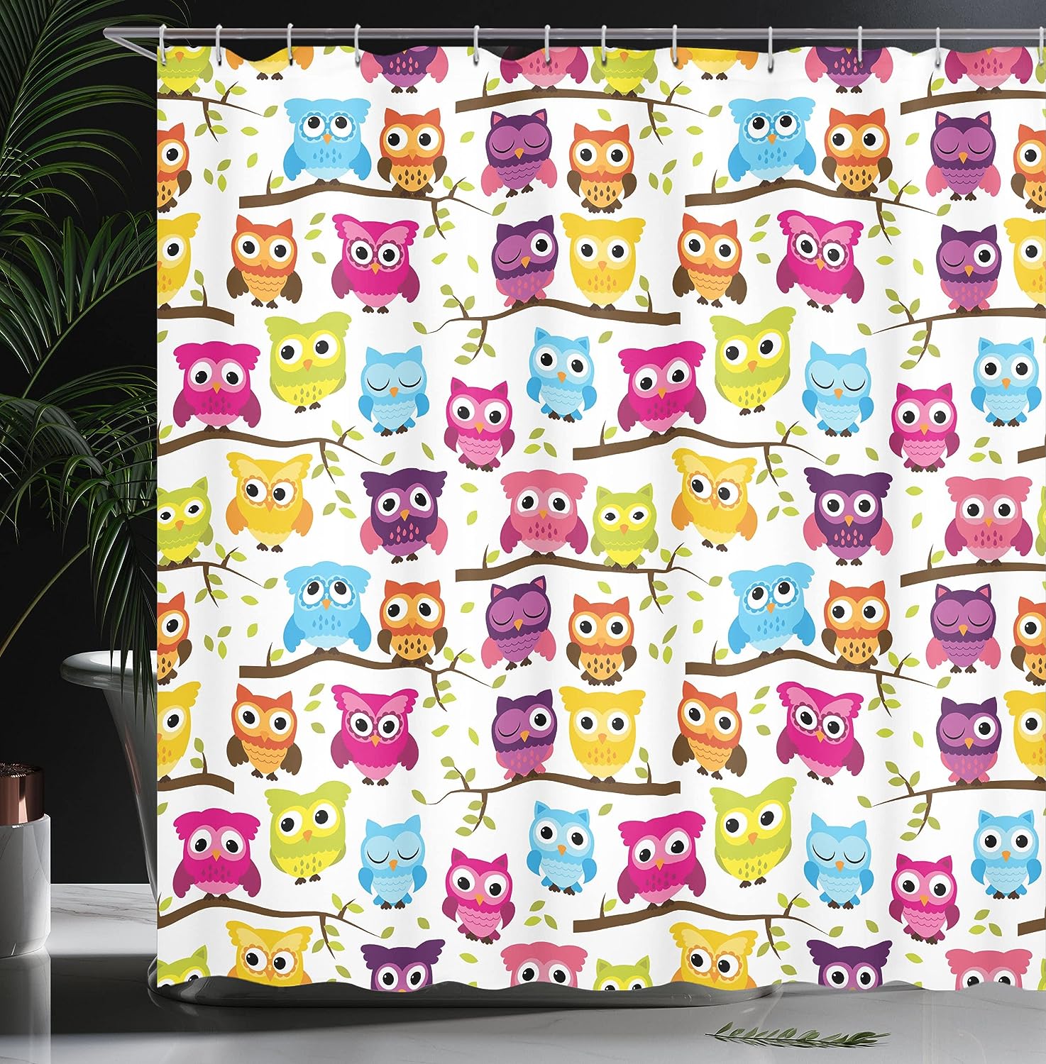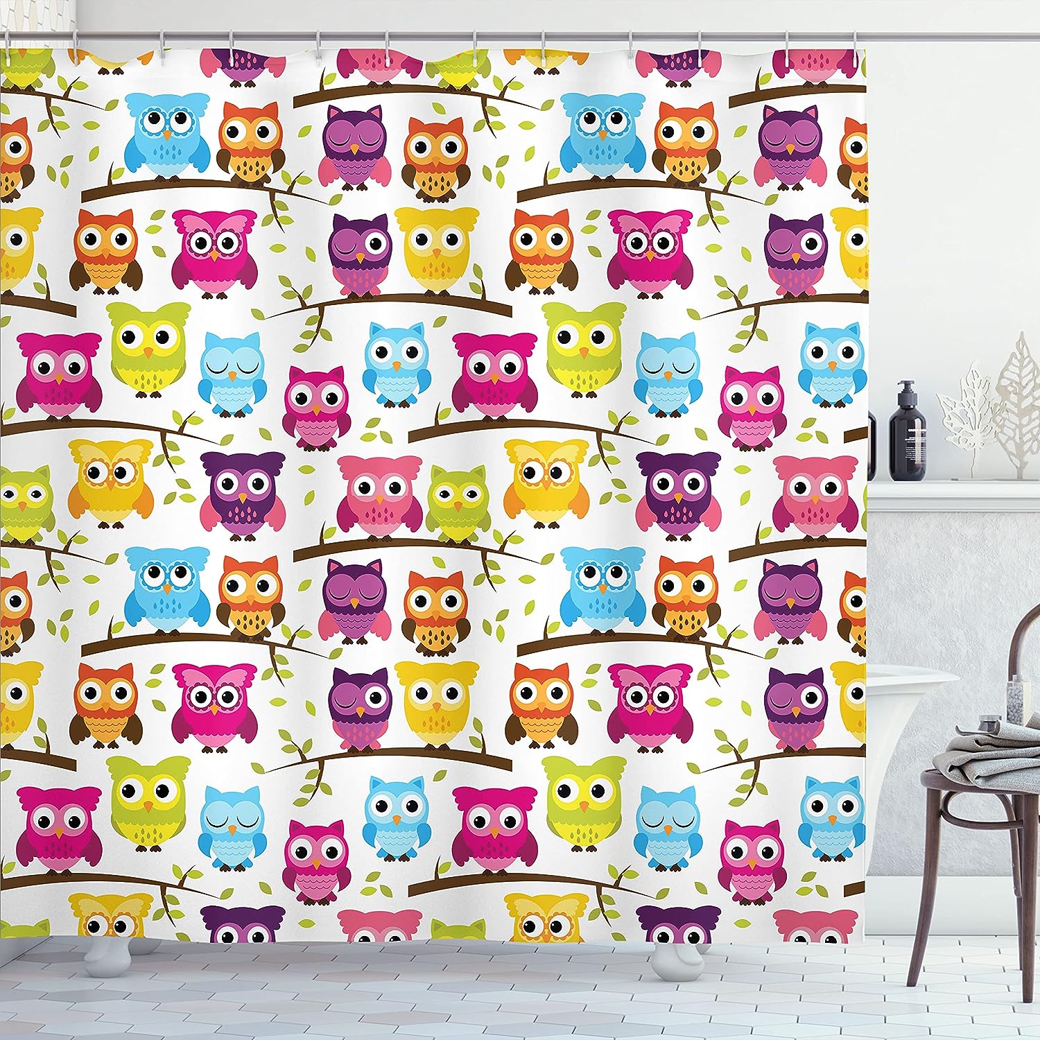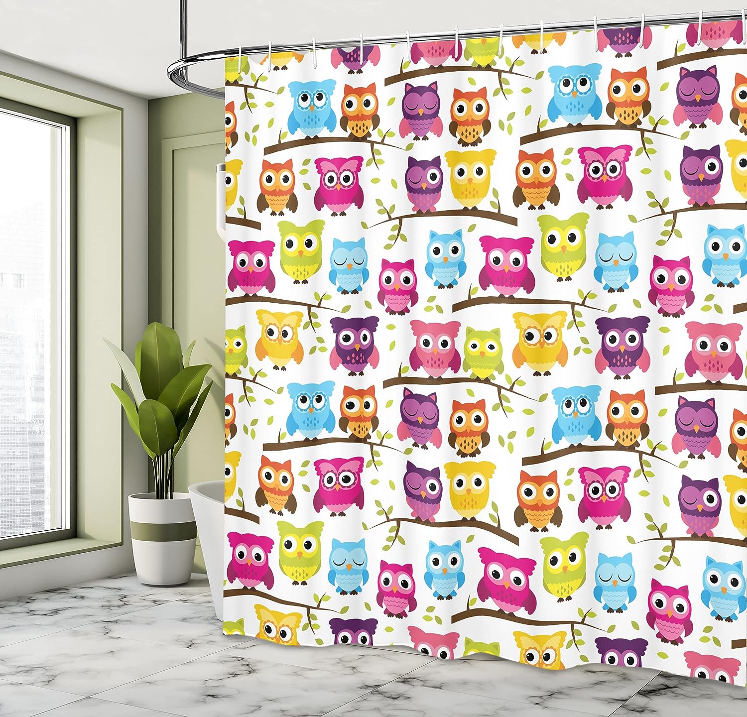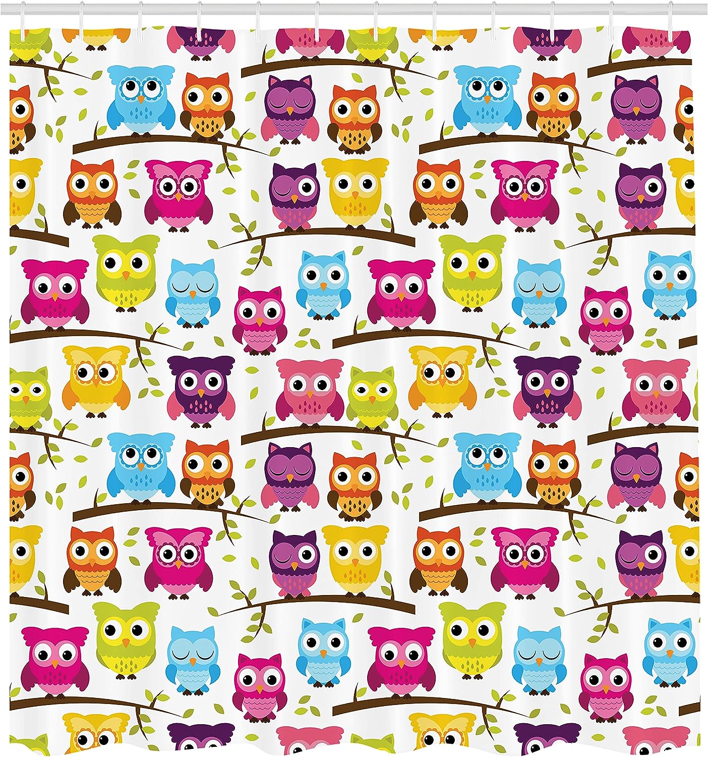 Green Magenta Owls Shower Curtain, Owls in the Forest Woodland Celebration Togetherness Themed, Bathroom Decor