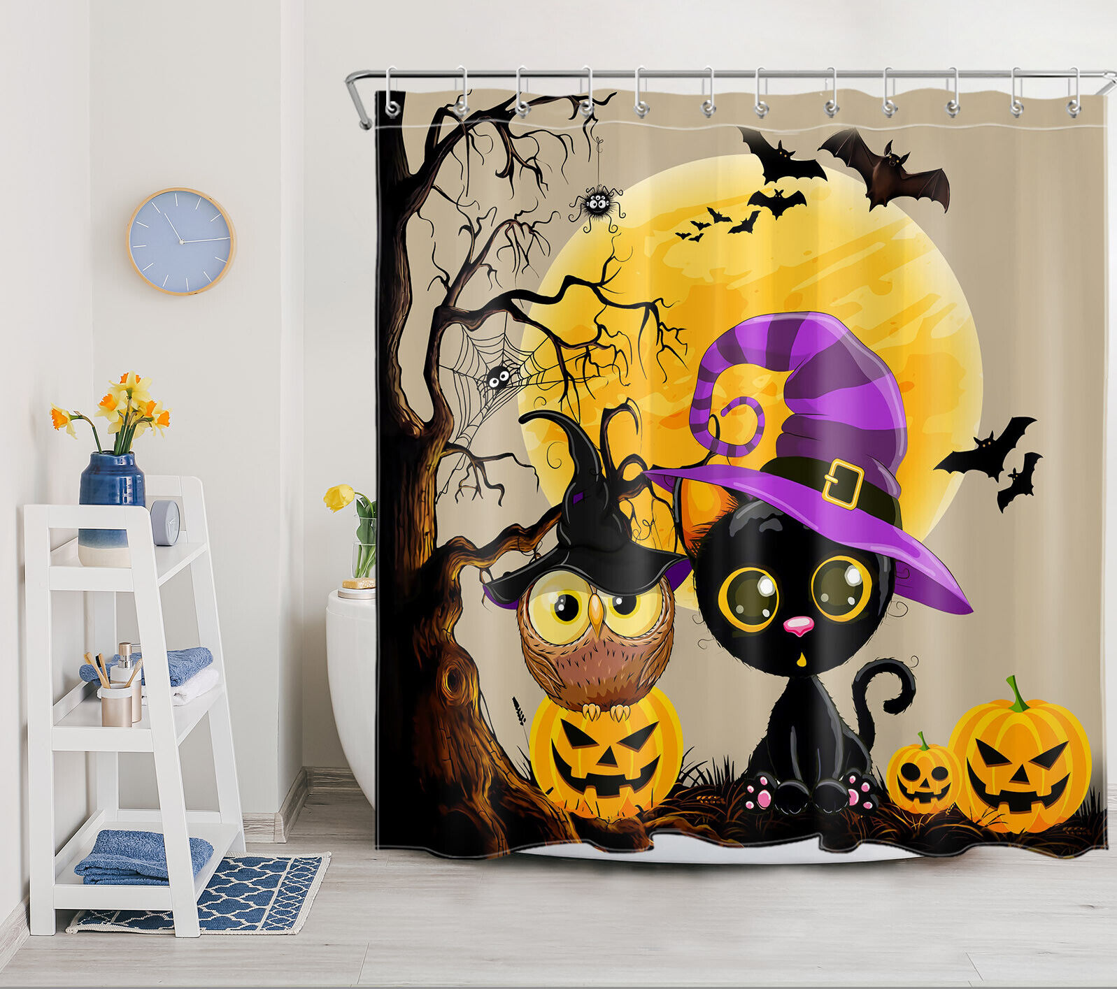 Halloween Bat Witch Hat Owl Cat Pumpkin Shower Curtain – Bathroom Accessories