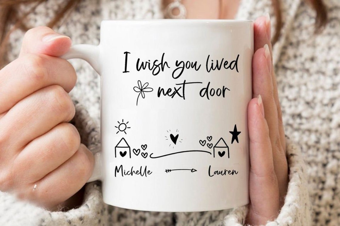 The “I Wish You Lived Next Door Mug” is a perfect gift for friends or family members who live far away, it’s a sentimental way to show them that distance doesn’t change the strength of your relationship. Customizable with states or any text you want, it’s a unique and personal gift that will remind them of your friendship every time they use it. It’s also a great way to let them know how much you miss them and how much you wish they lived closer.