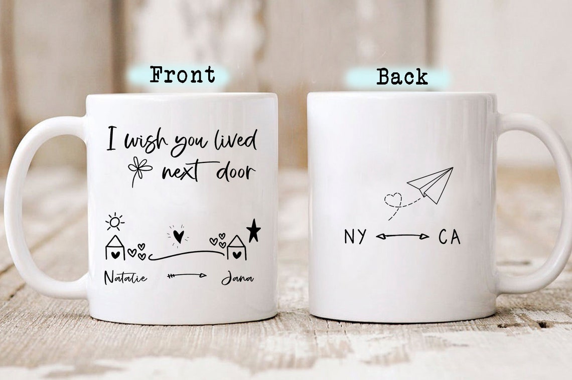 The “I Wish You Lived Next Door Mug” is a perfect gift for friends or family members who live far away, it’s a sentimental way to show them that distance doesn’t change the strength of your relationship. Customizable with states or any text you want, it’s a unique and personal gift that will remind them of your friendship every time they use it. It’s also a great way to let them know how much you miss them and how much you wish they lived closer.