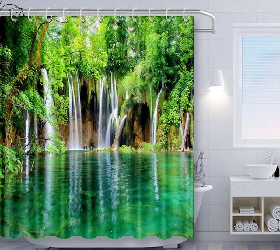 Invigorating Lagoon and Waterfall Nature Settings Shower and Curtain for Your Bathroom