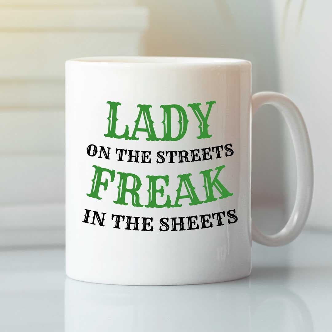 The Lady On The Street Freak In The Sheets Mug is a sassy and playful mug that adds a touch of attitude to your morning coffee or tea. Crafted with high-quality ceramic, this mug features a stylish design with the phrase “Lady On The Street, Freak In The Sheets” printed on both sides. It’s the perfect gift for someone who embodies both elegance and a wild side. With its generous size and comfortable handle, this mug ensures a delightful sipping experience. Embrace your inner duality and make a statement with the Lady On The Street Freak In The Sheets Mug.