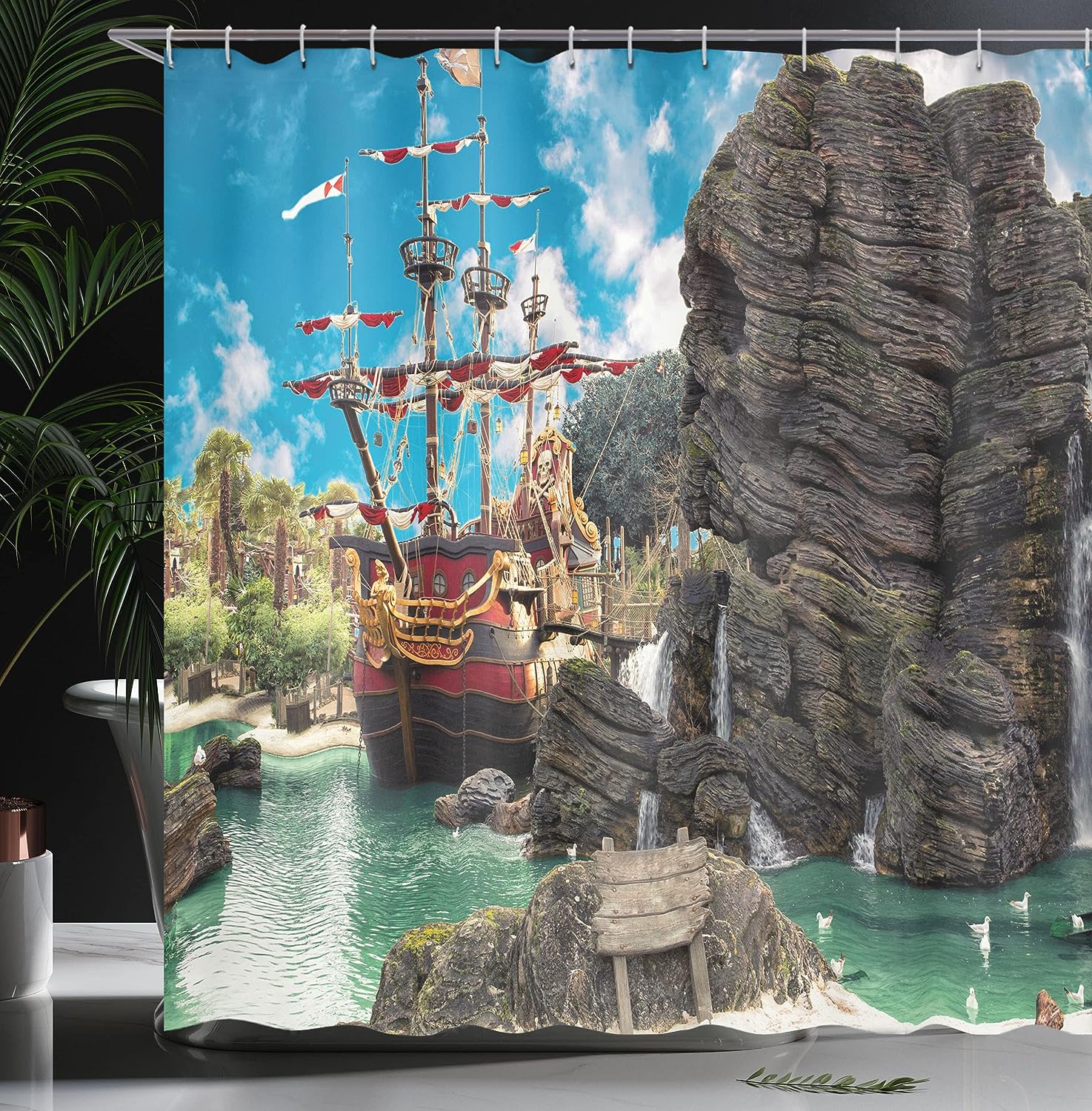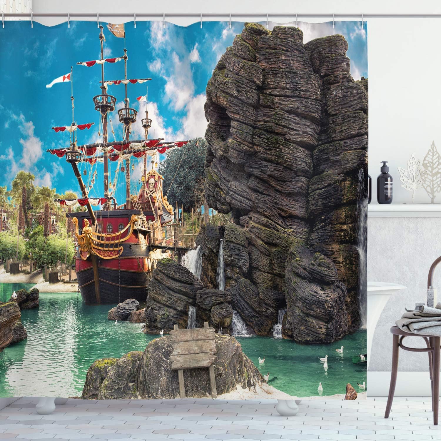 Large Ship on Pirate Island Shower Curtain with Rock Formation Bathroom Decor