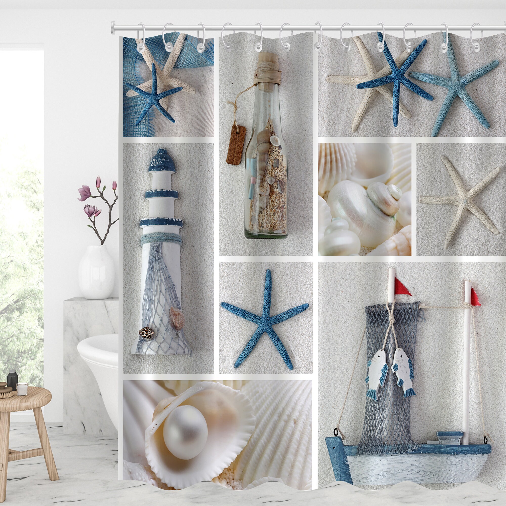 Living Life by the Seashore Fabric Shower Curtain with Starfish and Shell Design