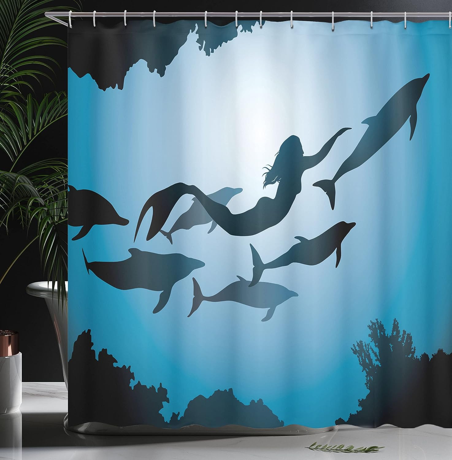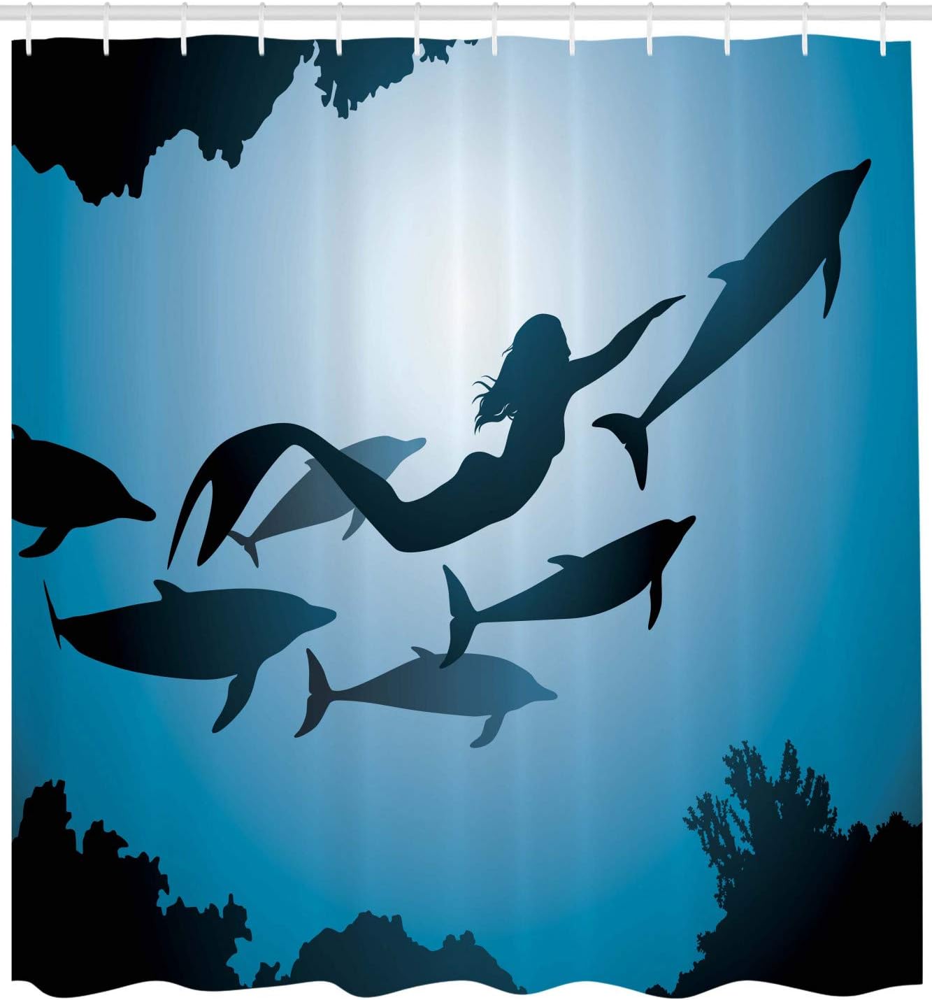 Mermaid Dolphin Shower Curtain, Underwater View Travel Diving Fin Sea Life, Underwater Bathroom Decor