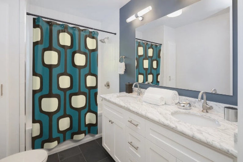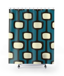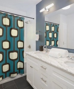 Mid Century Modern 70’s Retro Shower Curtain – Teal, Blue, Black, And Cream Geometric Design