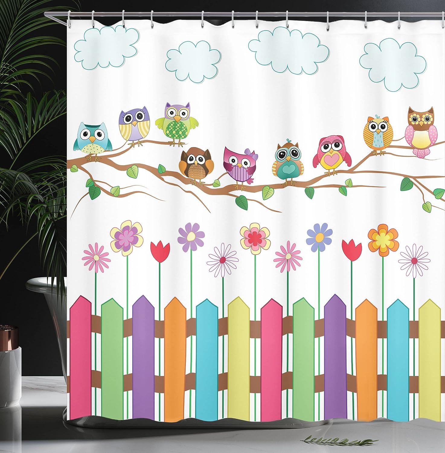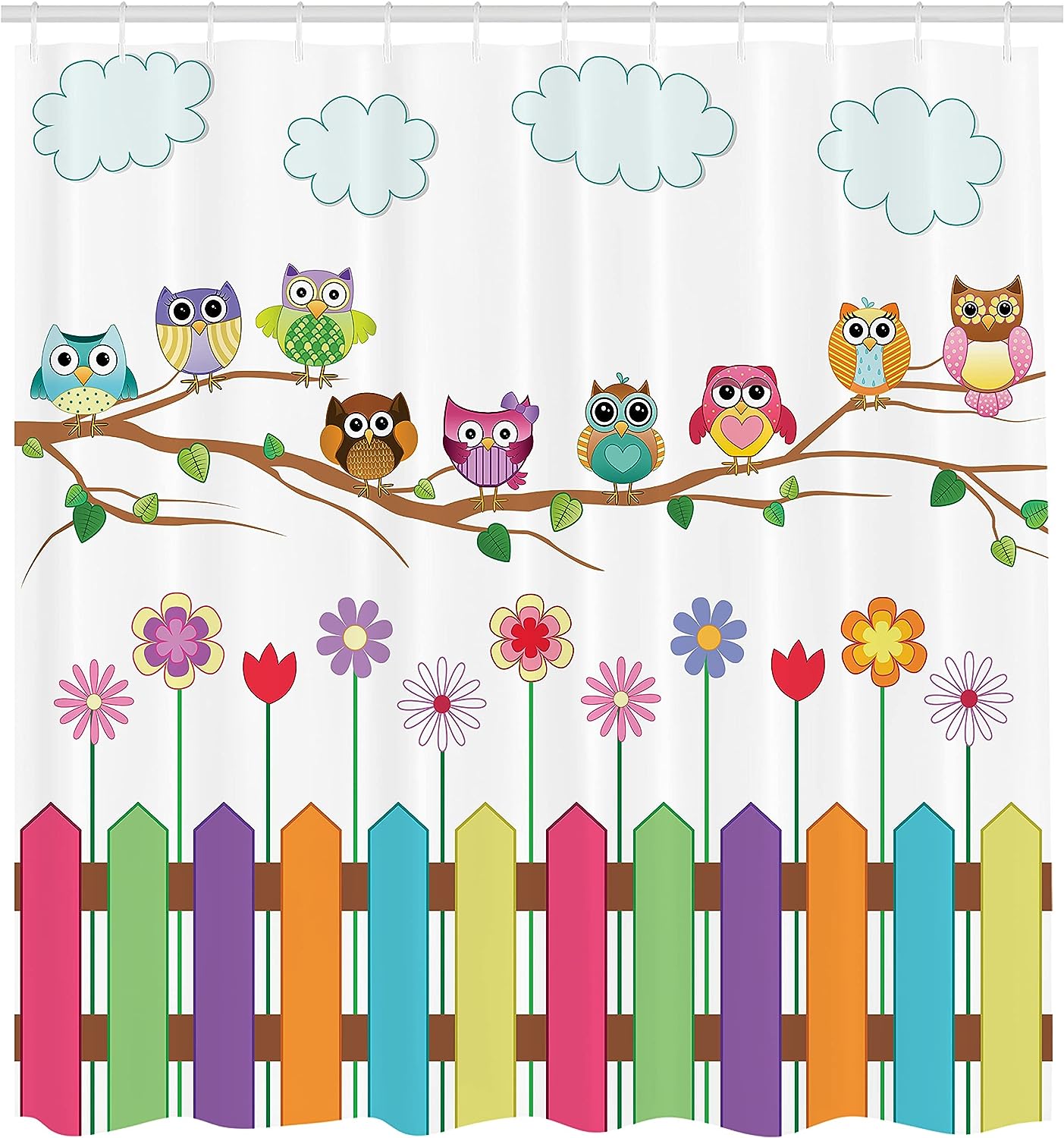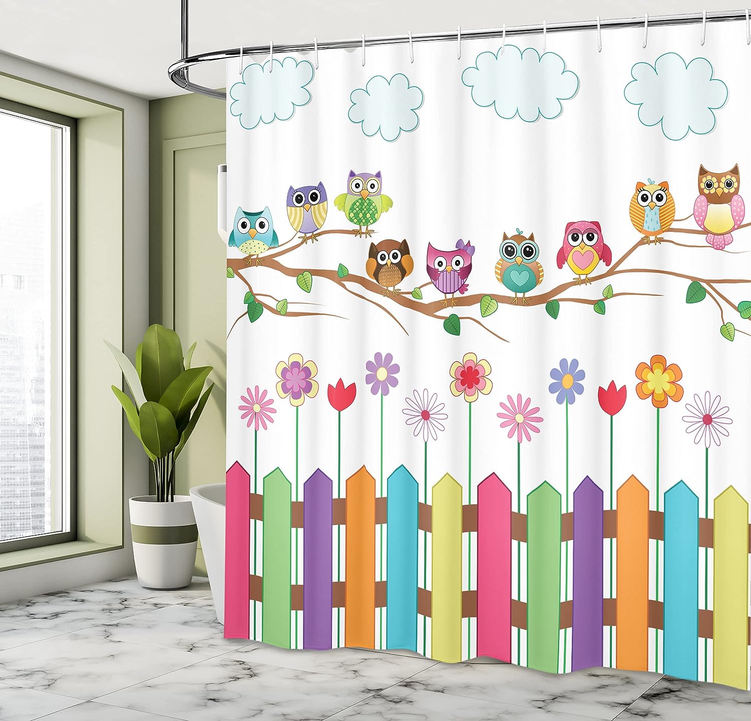 Multicolor White Brown Owls Shower Curtain, Owls on Branch Sunny Day in Countryside Farmhouse Wildflowers Art, Bathroom Decor