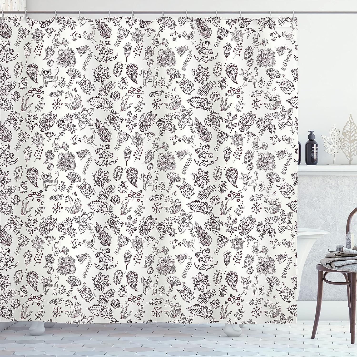 Nature Themed Doodle Art Playroom Shower Curtain with Animals Print Bathroom Decor