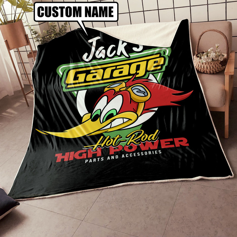 Personalized Hot Rod Garage Mr. Horsepower Woodpecker Blanket