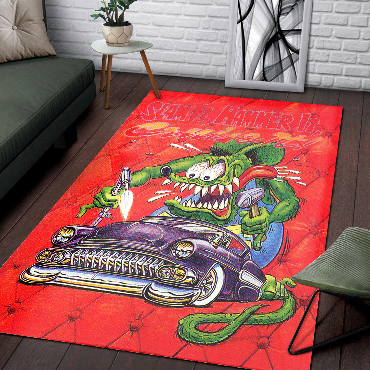 Unleash the rebellious spirit of Rat Fink with our striking Rat Fink Rug collection. Inspired by the iconic hot rod artist Ed “Big Daddy” Roth, these rugs feature edgy and eye-catching designs that bring a touch of vintage cool to any room. The Rat Fink Rug offers both style and durability, making it a bold statement piece for bedrooms, dens, and garage spaces. Embrace the counterculture vibe and pay homage to the legendary Rat Fink with this unique rug. Perfect for car enthusiasts, collectors, and those seeking an edgy touch to their decor. Upgrade your space with the Rat Fink Rug and celebrate a classic symbol of American subculture.