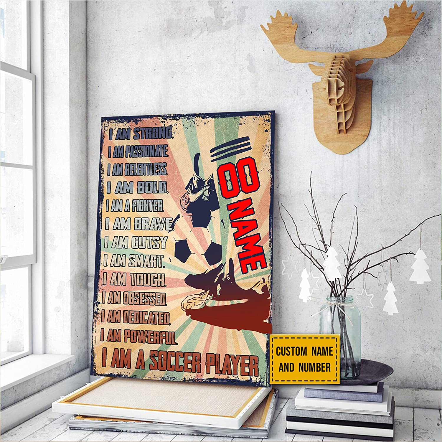 Personalized Soccer Poster, I Am Strong Soccer Player Inspirational Soccer Wall Art Print Canvas Men Boy’s Bedroom Decor