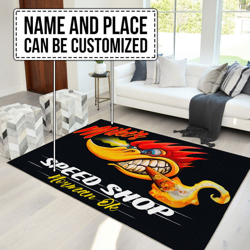 Personalized Woodpecker Speed Shop Area Rug for Hot Rod Lovers