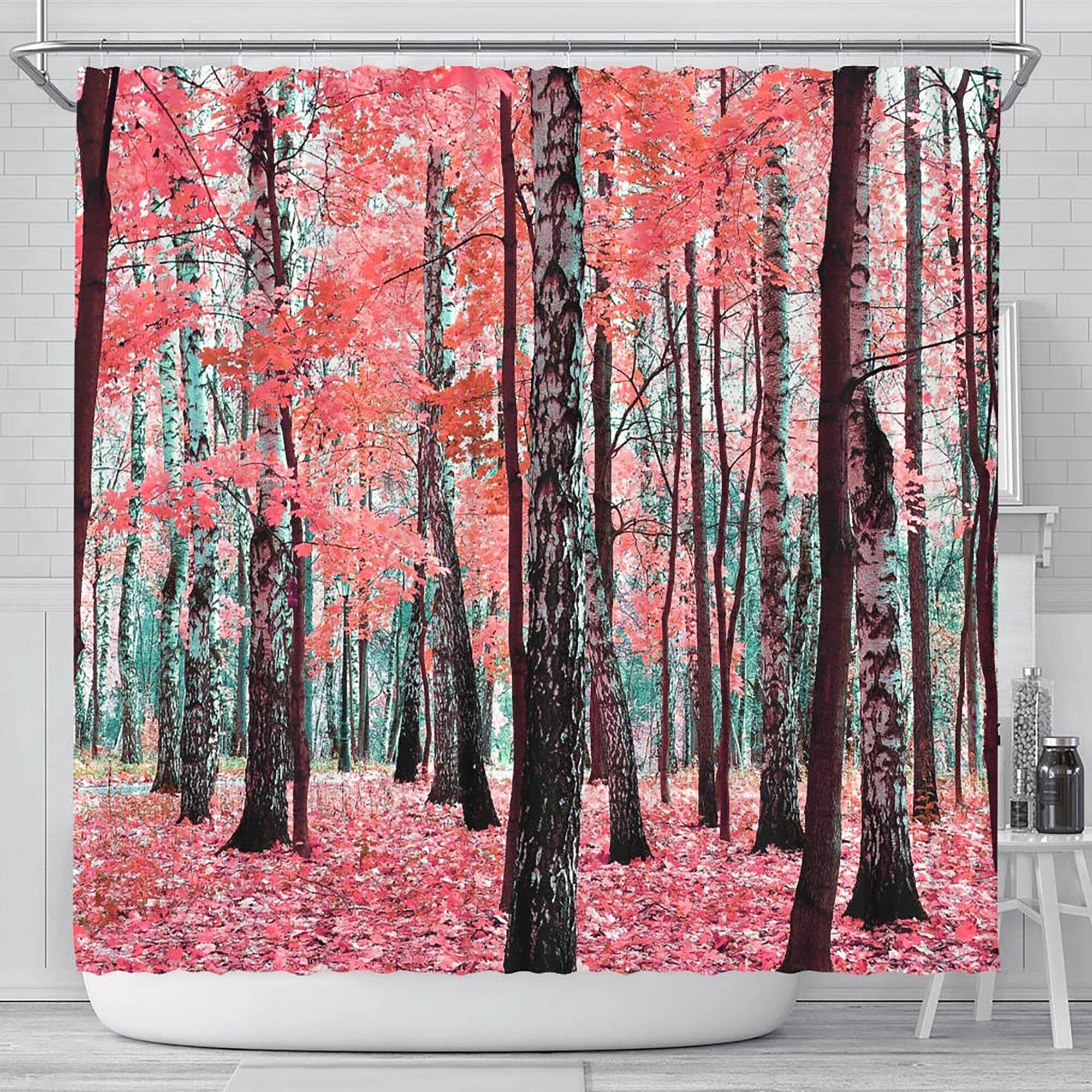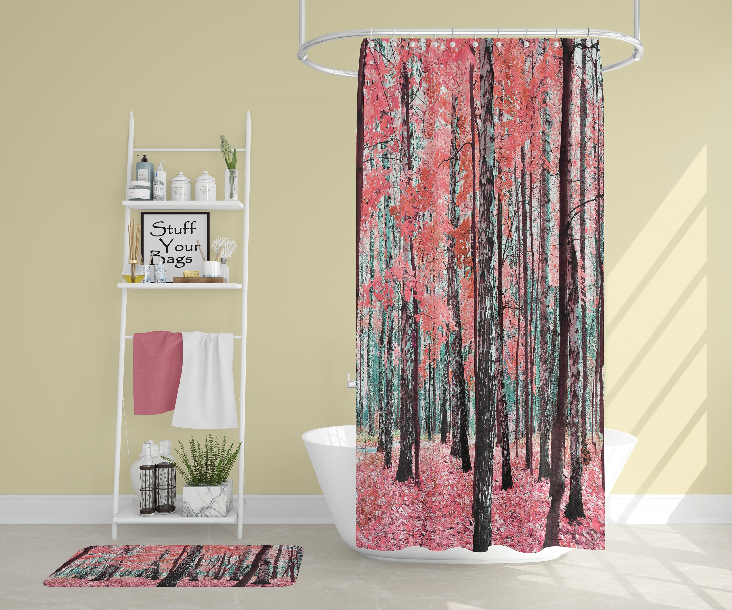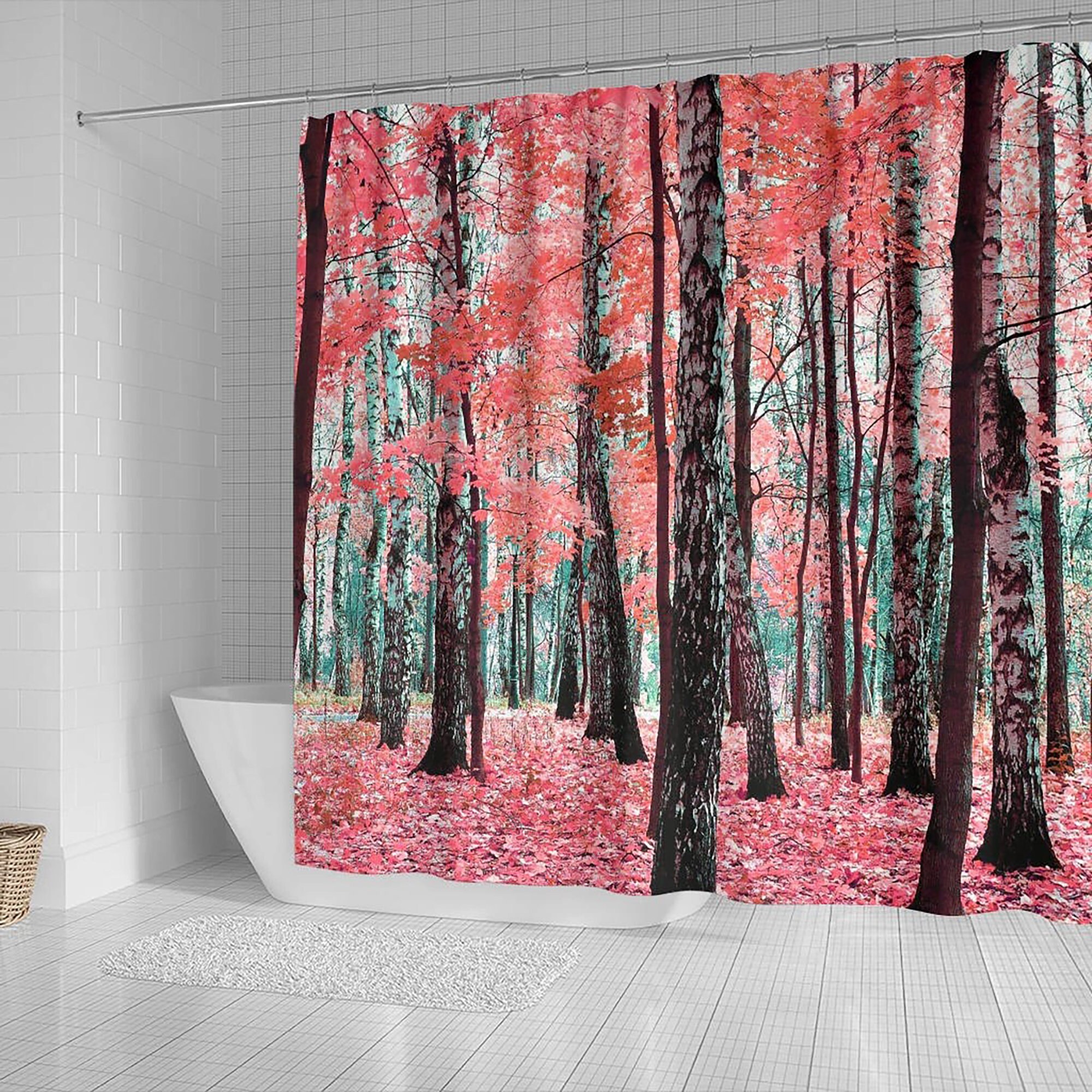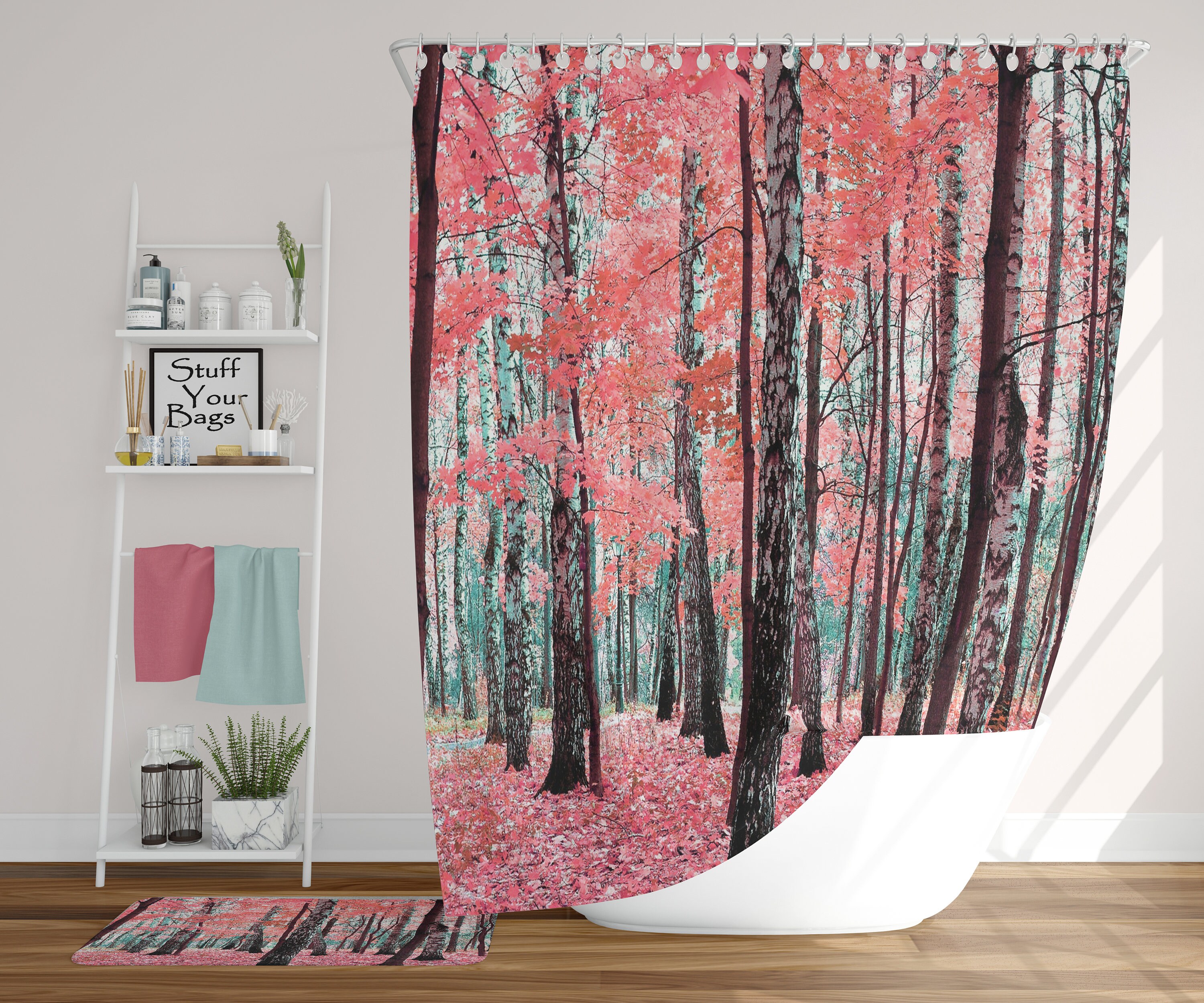 Pink Leaves Shower Curtain for Bathroom Decor – Mystic Forest Artwork