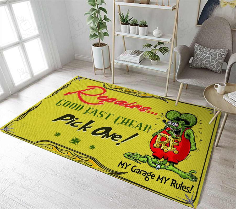 Rat Fink Repairs Good Fast Cheap Area Rug Hot Rod Rug for Garage