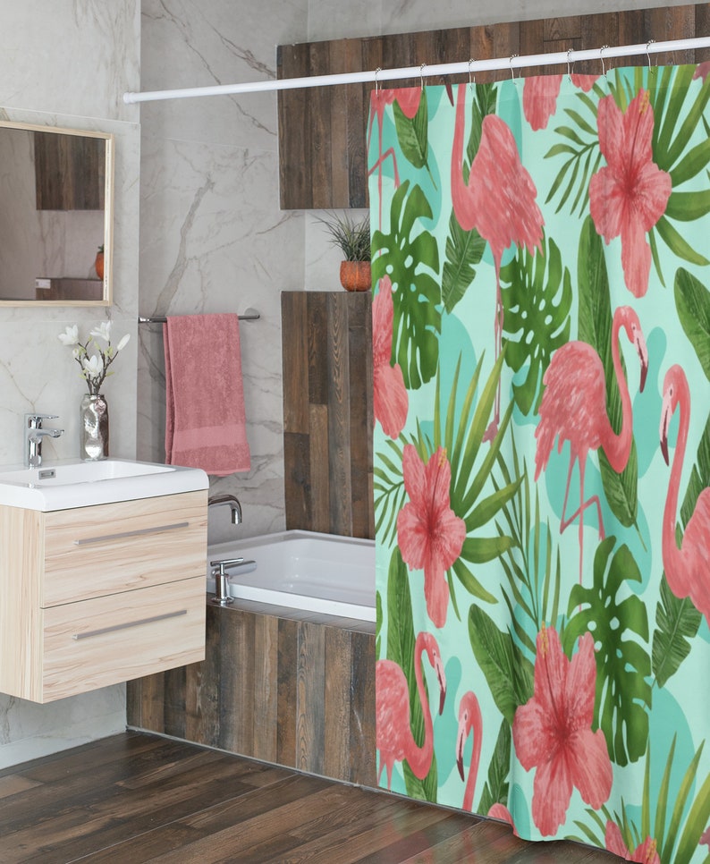 Retro Flamingos Shower Curtain, 60’s 70’s Decor, Tropical Floridian Hawaiian Nostalgia Shower Accessory, Retro Bathroom Curtain