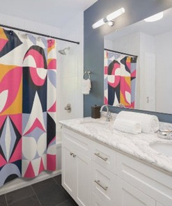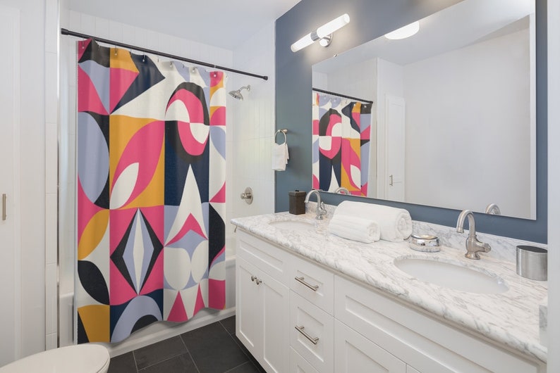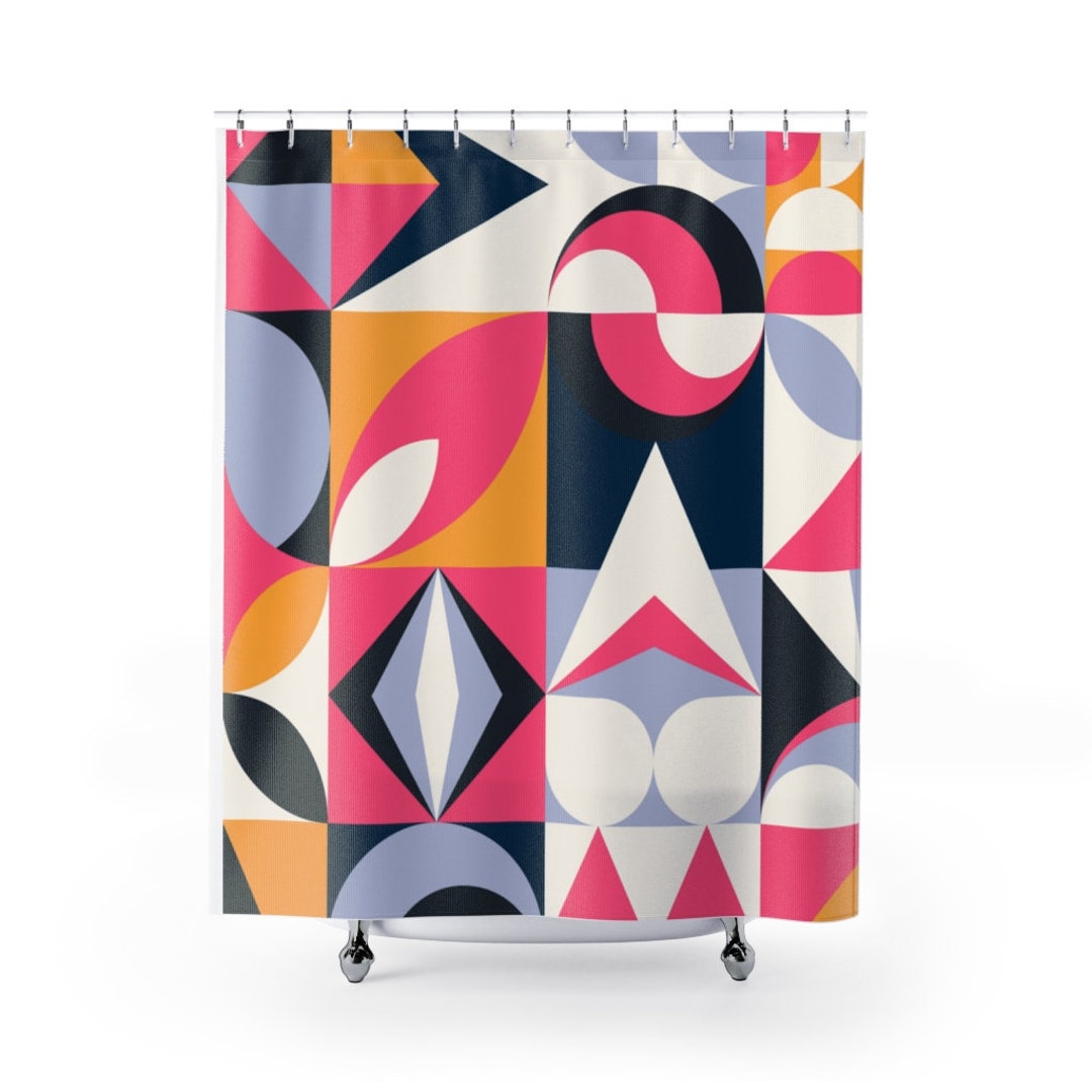 Retro Shower Curtain, Mid Century Modern Funky Fun Pink, Blue, Mustard Yellow, Ice Gray, And White Retro Shower Curtain