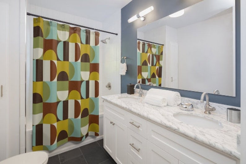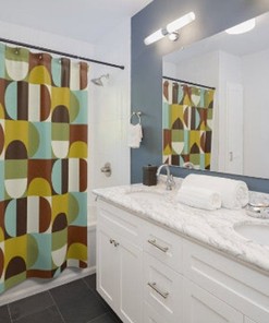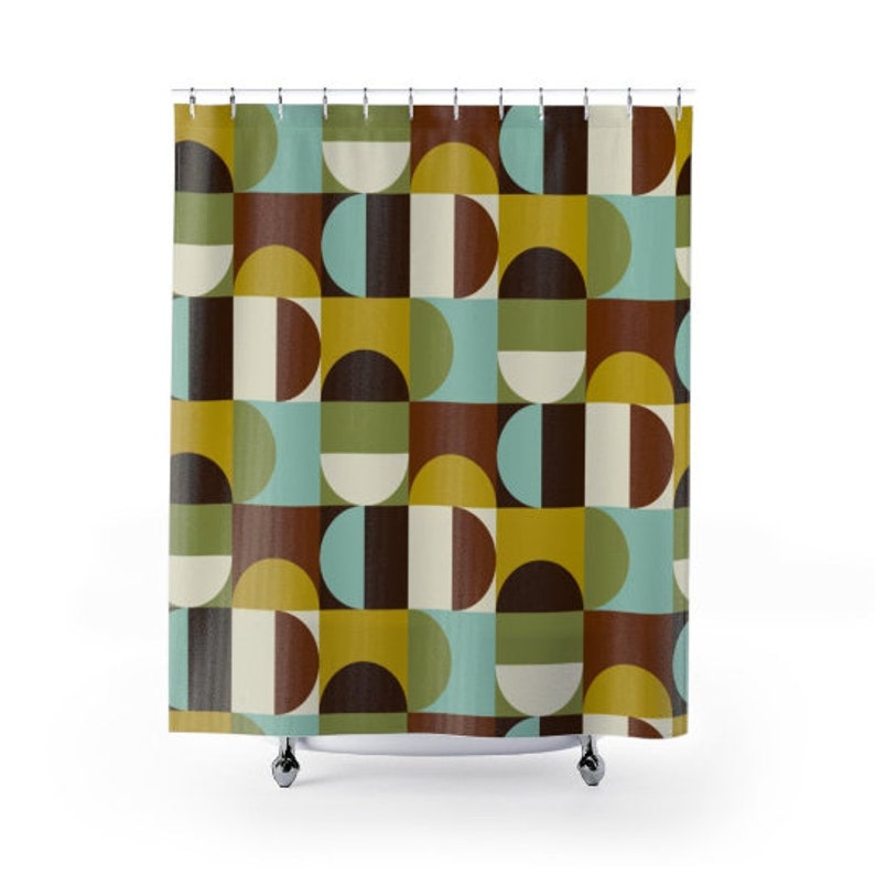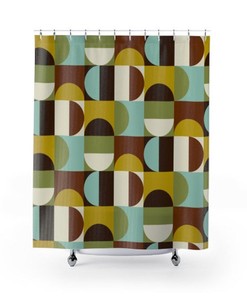 Retro Shower Curtain, Retro Geometric Mid Century Modern Chocolate Brown, Teal, Green And White Shower Curtain