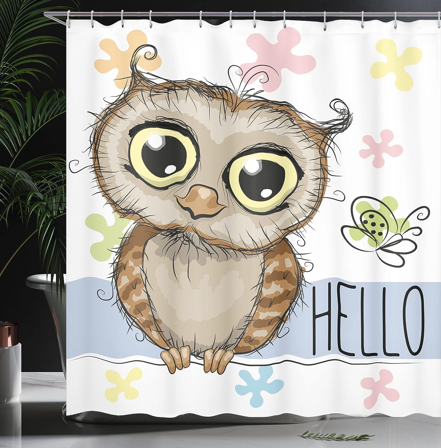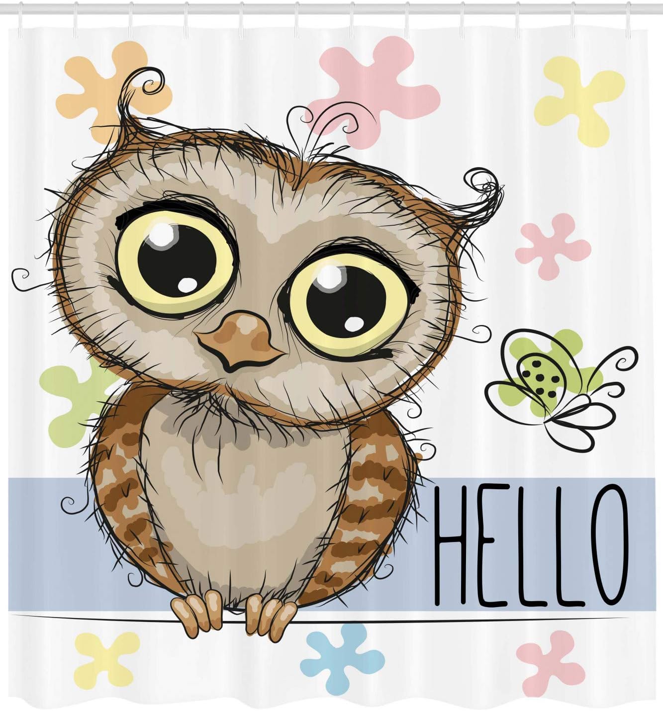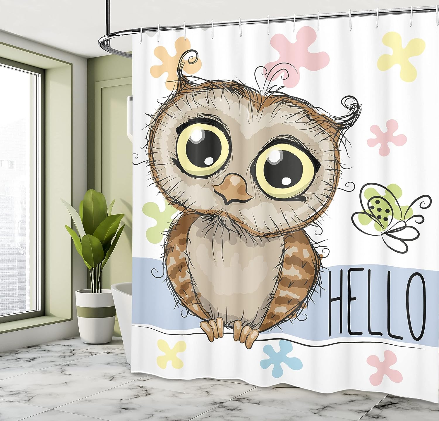 Rose Cadet Blue Brown Owls Shower Curtain, Cartoon Owl and Butterfly on Floral Background, Bathroom Decor