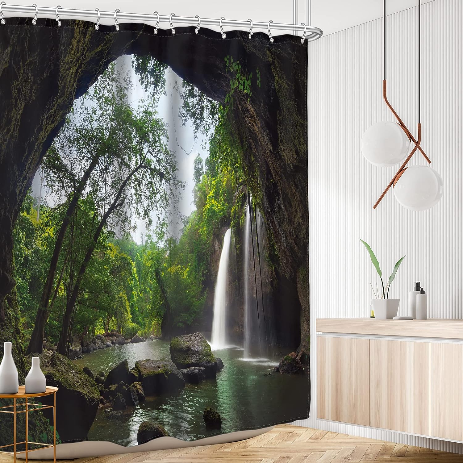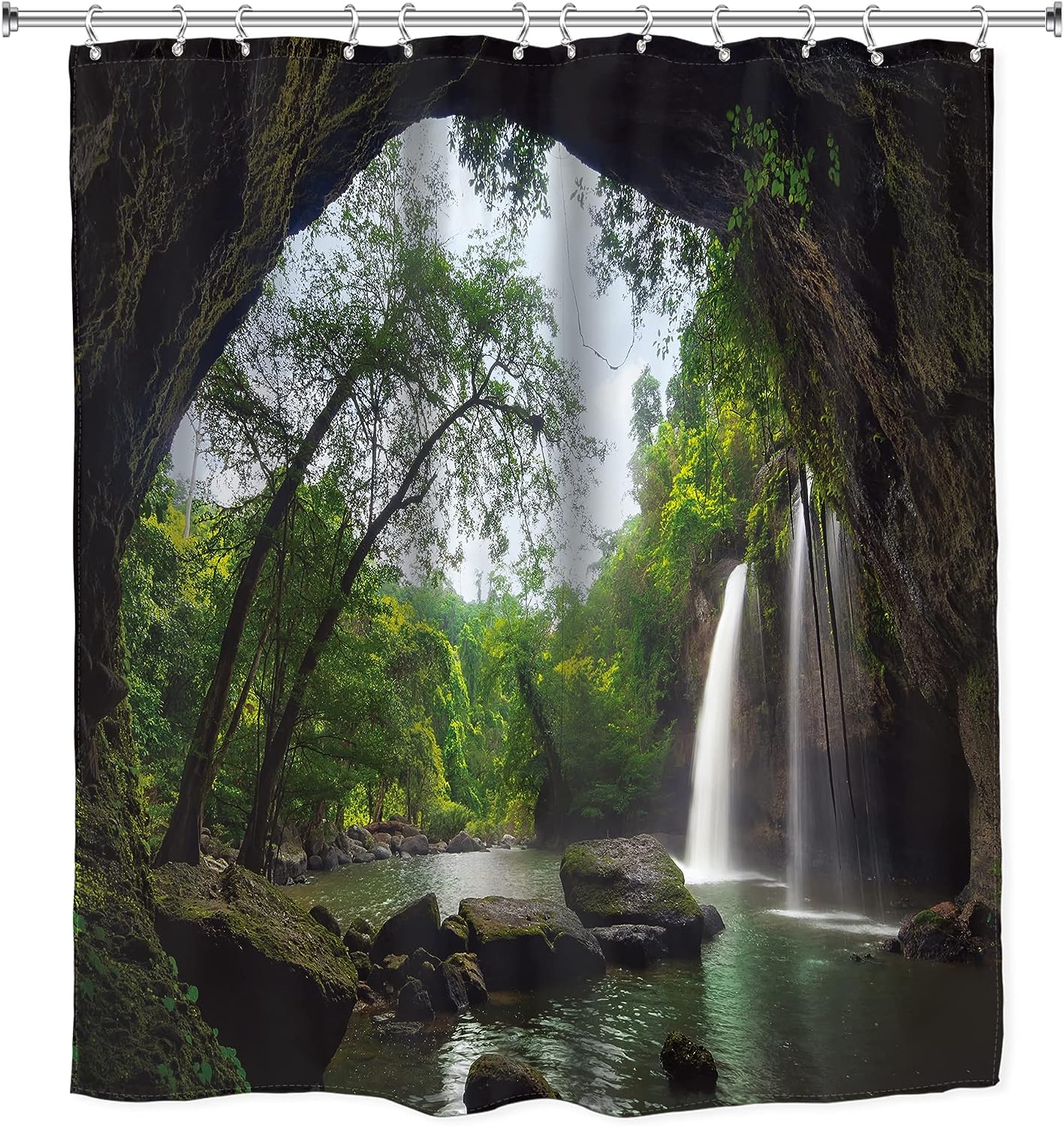 Rustic Scenic Waterfall Shower Curtain for a Nature-inspired Bathroom Decor