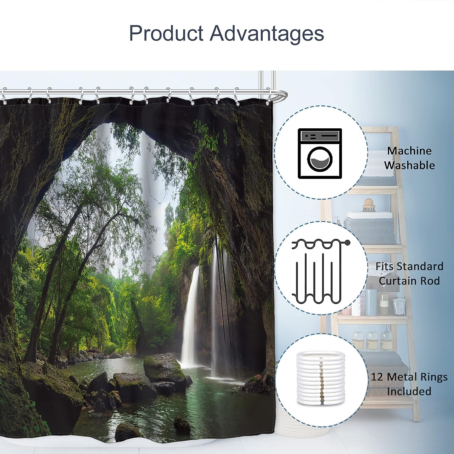 - The curtain is also easy to maintain and install. It is machine washable in cold water, and the gentle cycle and low temperature drying ensure that the colors will not fade. The curtain comes with built-in metal ring holes, making it easy to install and ensuring that the rings slide smoothly without jamming.