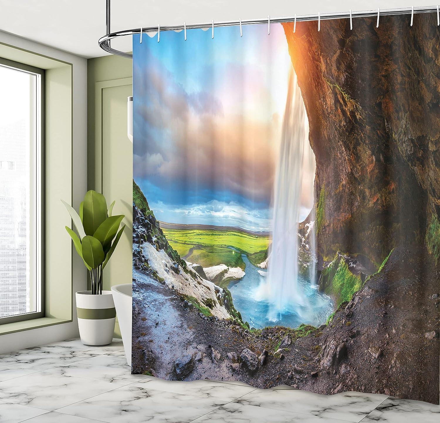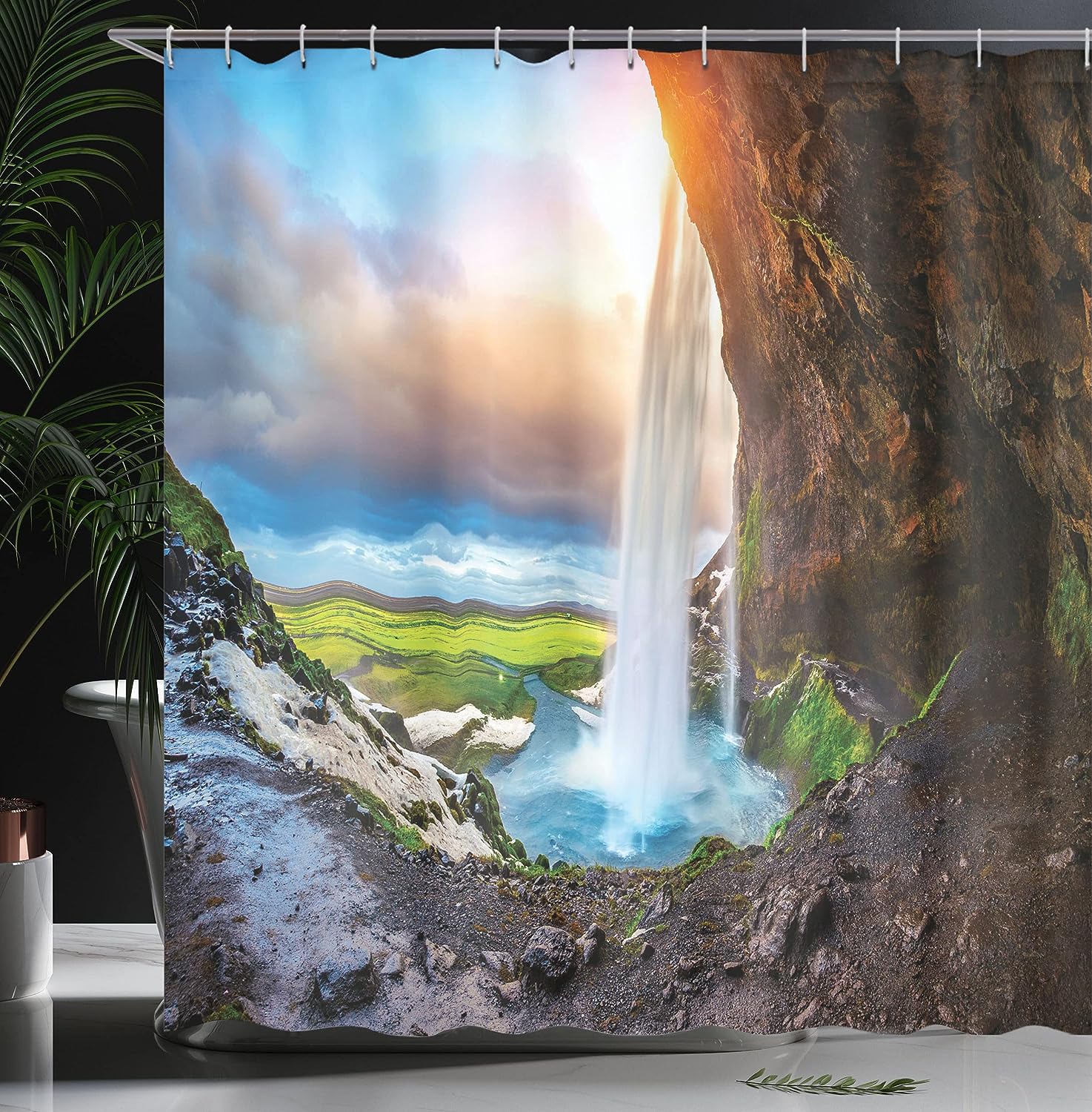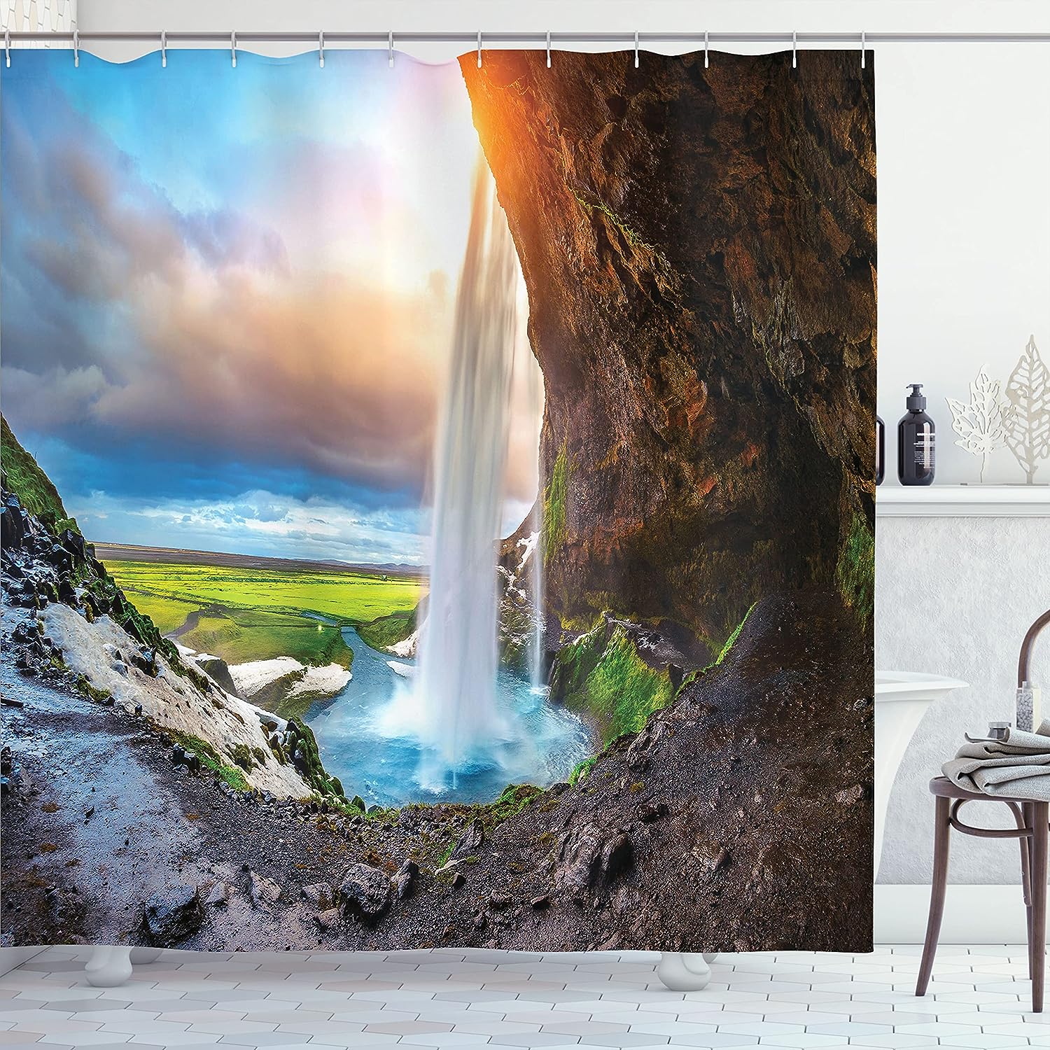 Seljalandsfoss Waterfall Shower Curtain, Scenery Sunset Cloudscape Print for Bathroom Decor, Blue Orange and Green Cloth Fabric